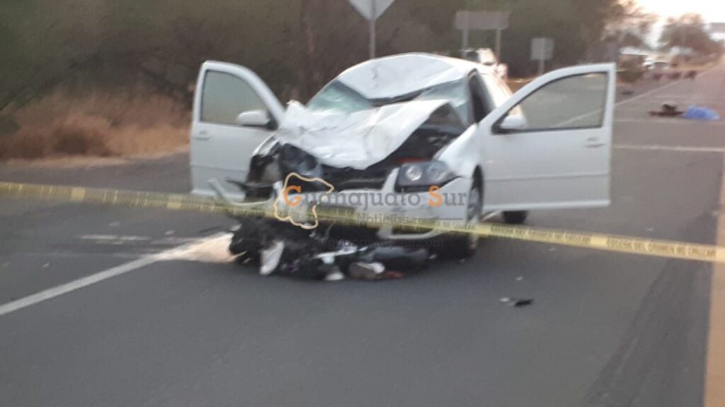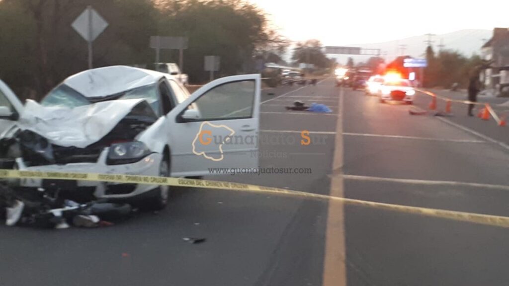 Se recibieron varios reportes al sistema de emergencias 911 donde se informaba sobre un accidente vehicular del tipo choque entre una motocicleta y un automóvil color blanco sobre la carretera Yuriria-Valle de Santiago, frente a las instalaciones de policía federal.