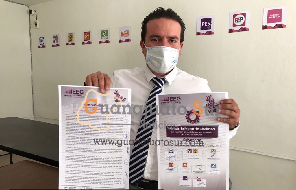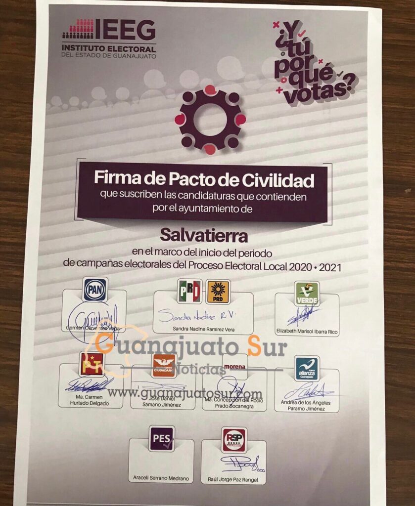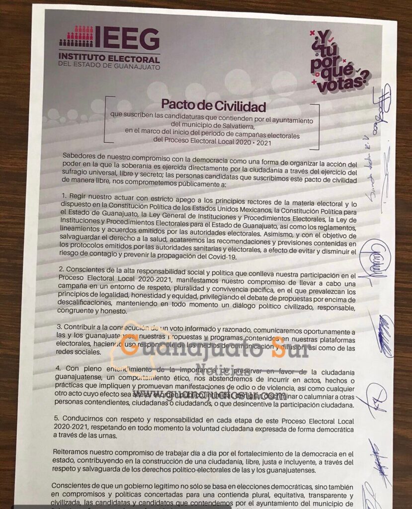Firman el Pacto de Civilidad todos los candidatos a la presidencia municipal de Salvatierra ante el Instituto Electoral del Estado de Guanajuato donde se comprometen a llevar una campaña honesta y de respeto ante los demás candidatos y la ciudadanía.