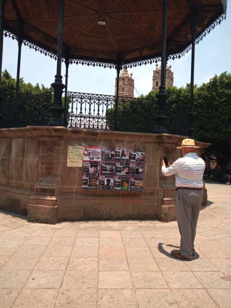 El colectivo Mariposas Destellando Buscando Corazones y Justicia hicieron circular a través de redes sociales las imágenes del quiosco, que se ubica en el centro del jardín principal, donde se encuentran las fotografías de algunas personas que se encuentran desaparecidas y algunas otras que fueron localizadas en las fosas clandestinas.