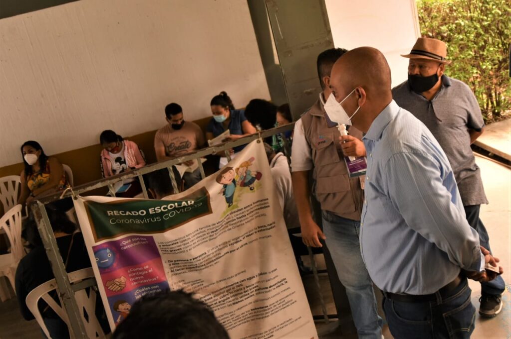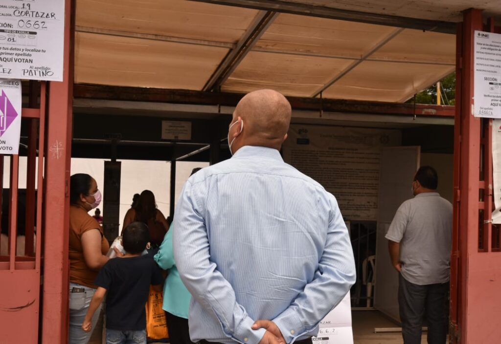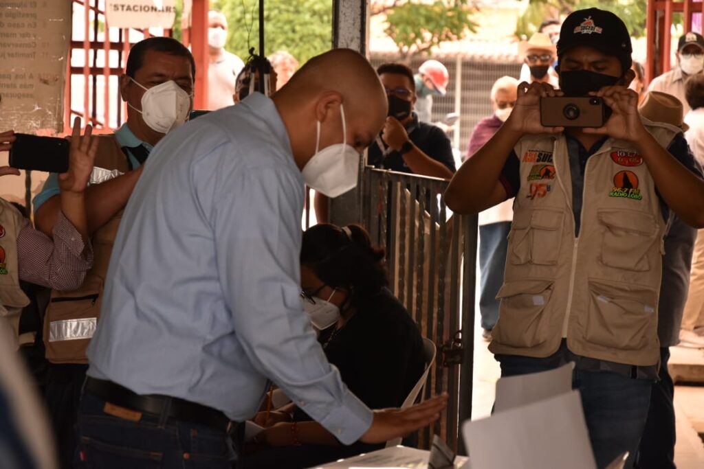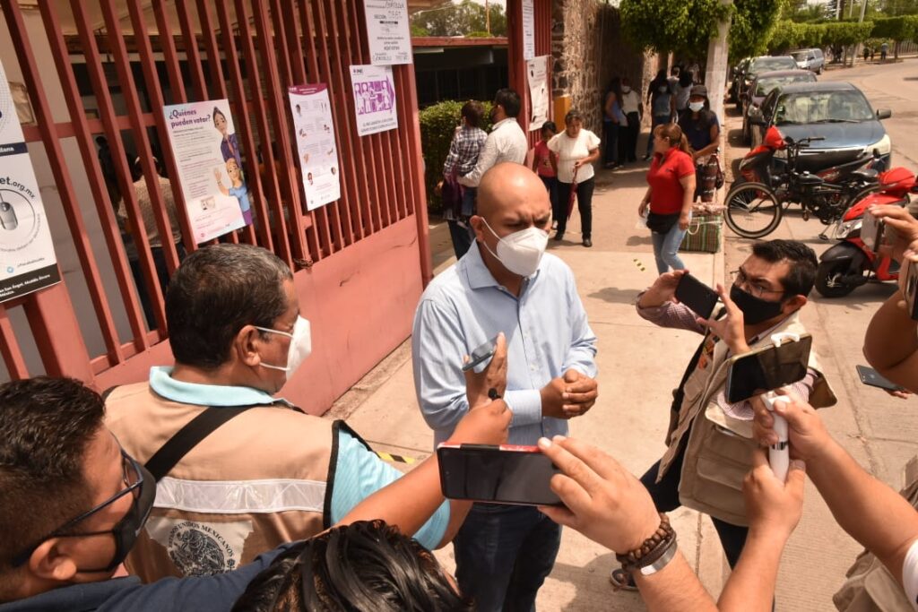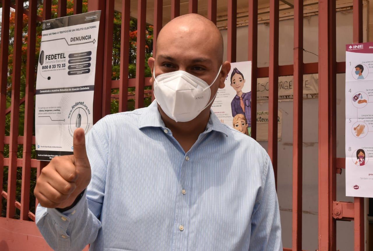 Luego de pasar por el proceso de sanitización, y los diferentes módulos montados para la elección, el candidato depositó sus 3 boletas para candidatos de Ayuntamiento y Diputaciones Local y Federal.