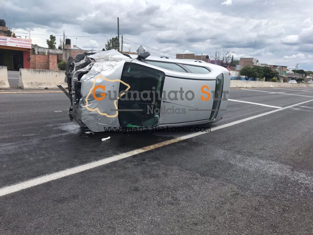 Una mujer sufrió una volcadura mientras conducía sobre la carretera Salvatierra-Celaya, a la altura de la colonia San Juan, por fortuna no sufrió lesiones y todo quedó en daños materiales.
