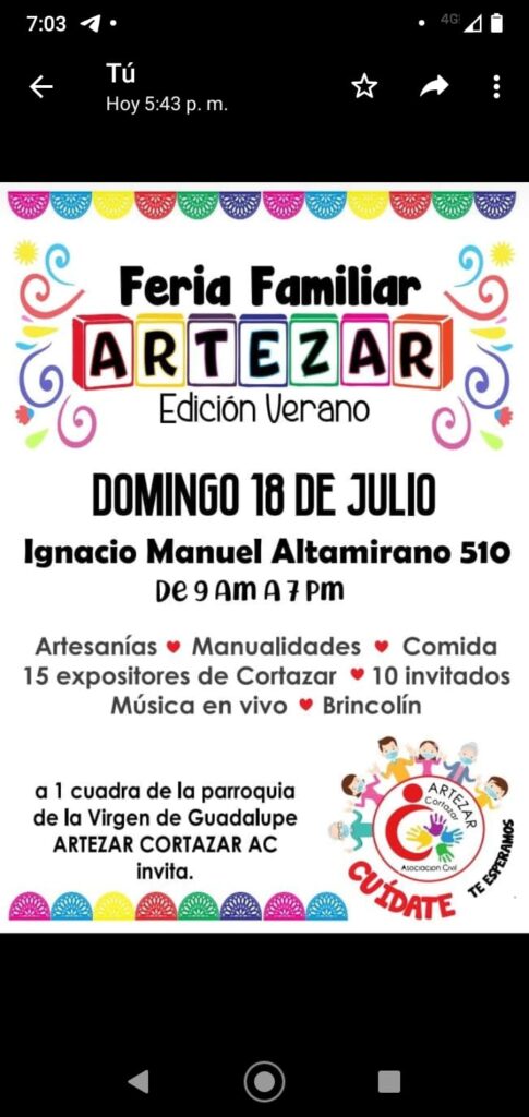 La Asociación Civil Artesanos y Emprendedores de Cortázar (ARTEZAR) hace la invitación al público en general a su evento “Feria de la Familia” con el que celebrarán su segundo aniversario.