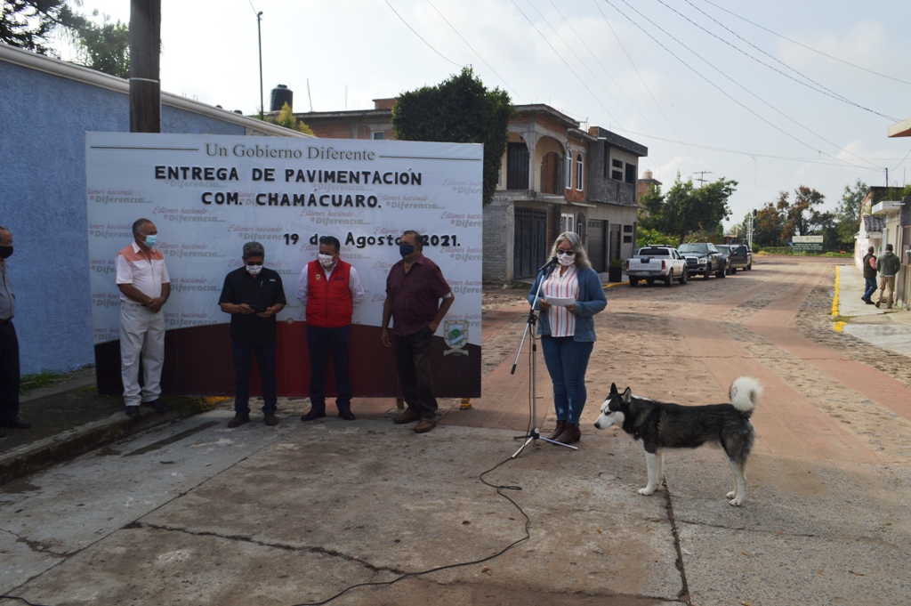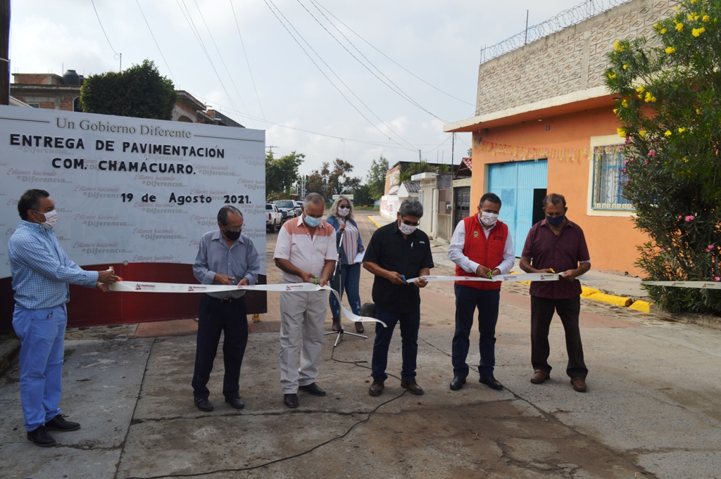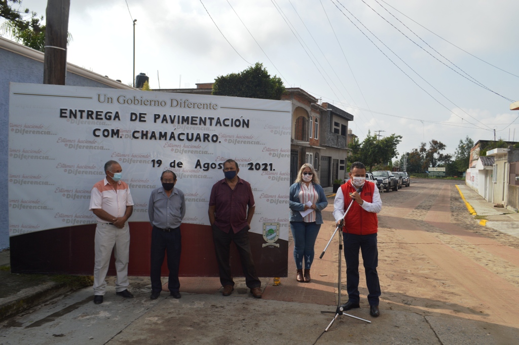 El Alcalde, Lic. Alejandro Tirado Zúñiga, hizo entrega de la obra de pavimentación del acceso a la comunidad de Chamácuaro, por la calle Hidalgo; obra donde se ven reflejados los beneficios del programa de Entrega de Cemento, que promovió este año el municipio, de manera directa.