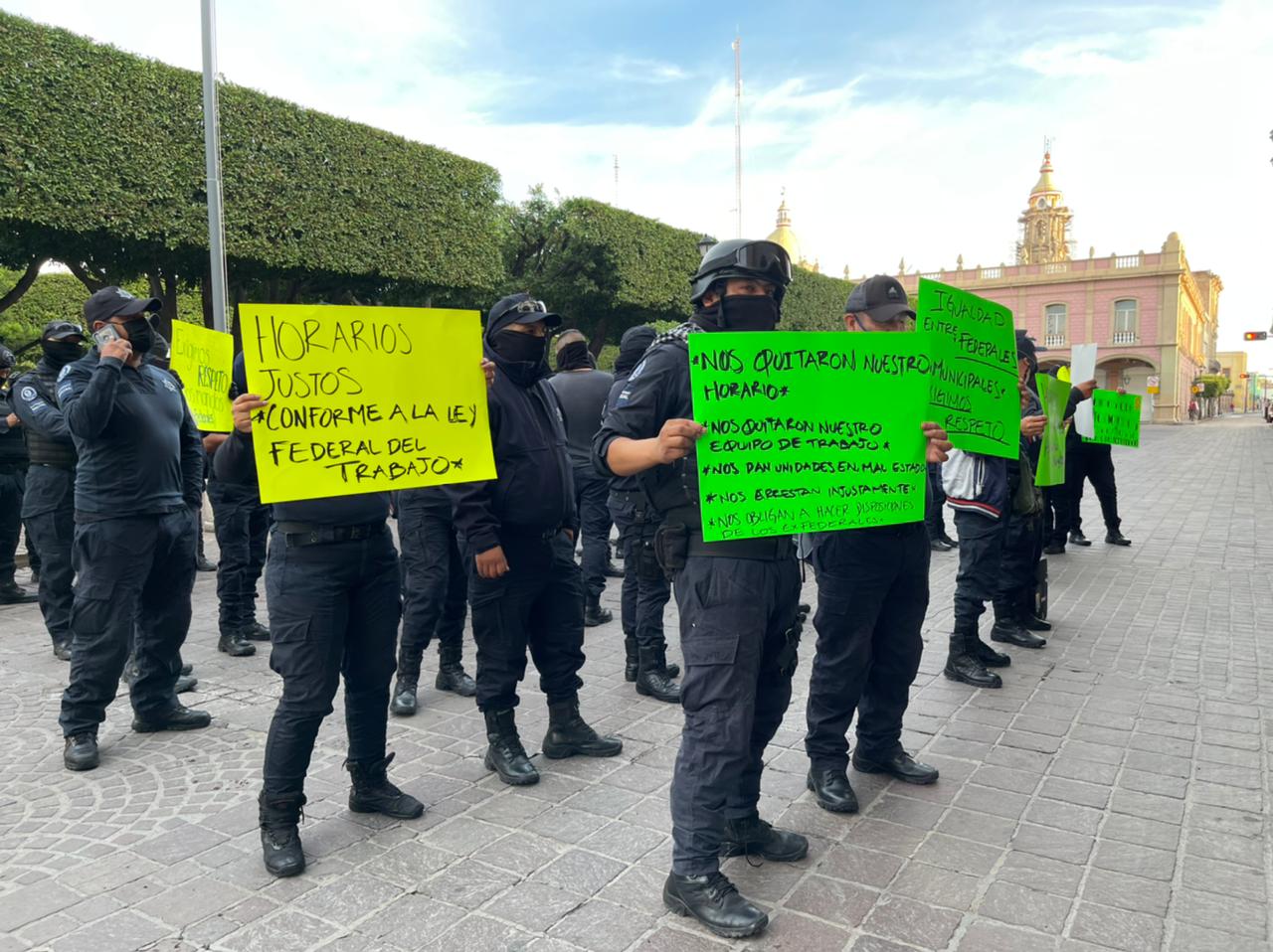 Pancartas como “Exigimos que si trabajamos horas extras se nos dé una remuneración”; “Condiciones respetables, humanas y dignas”, “Horarios justos”, “Exigimos que se respeten nuestros horarios 24X48”; entre otras consignas fueron mostradas por elementos municipales quienes se plantaron poco antes de las 7:00 de la mañana de este lunes afuera de las instalaciones de la Presidencia Municipal.