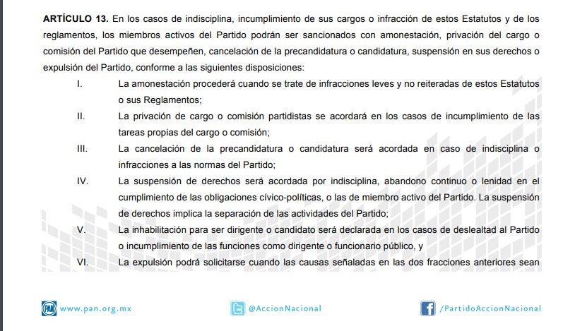 Los estatutos, publicados en la página web del Partido Acción Nacional https://www.pan.org.mx/ muestran claramente en su artículo 13, fracc. VI que los militantes que participen con otro partido político deben ser expulsados de su militancia, la pregunta es, ¿procederán? O seguirán dejando pasar traiciones.