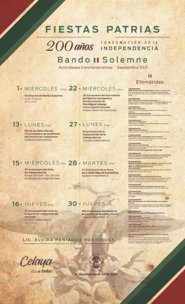 Con la ceremonia para develar el Bando Solemne, en el jardín principal, este miércoles 1 de septiembre, el municipio de Celaya dio inicio a las Fiestas Patrias, conmemorando el Bicentenario de la Consumación de la Independencia.