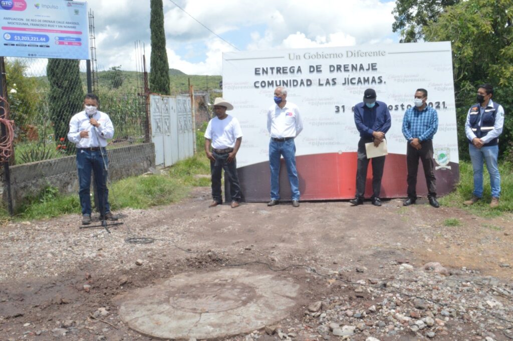 En la comunidad de Las Jícamas fue entregada la obra de ampliación de la rede drenaje sanitario de las calles Abasolo, Moctezuma, Francisco Ruiz y una calle más, logrando colocar 1,377 metros lineales de tubería, así como la construcción de 39 pozos de visita, llevando beneficio directo a 74 familias de este lugar; el costo de la obra fue de $3’203,221.44, con concurrencia de recursos del estado y el municipio.