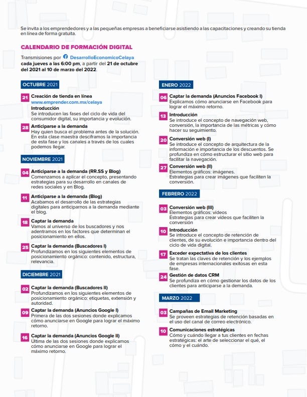 El Municipio de Celaya a través de la Dirección General de Desarrollo Económico lidera la agenda de capacitación digital que se están desarrollando todos los jueves a partir del pasado 21 de octubre y hasta la primera quincena de marzo del 2022.