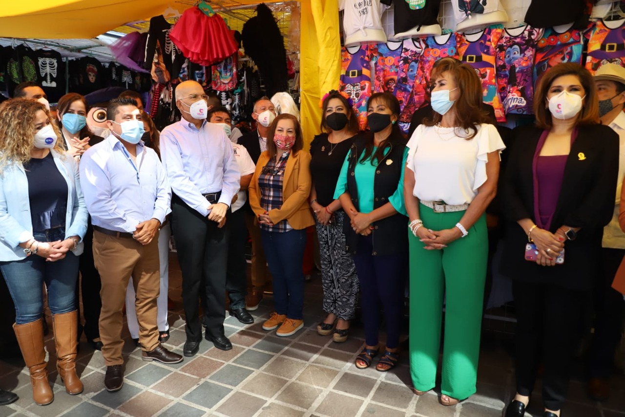 Acompañado por integrantes del Ayuntamiento, directores de las dependencias, líderes de las uniones de comerciantes que participan y público asistente, el presidente municipal realizó un recorrido por los diferentes pasillos donde los artesanos y comerciantes ofrecen sus productos tradicionales de estas fechas: alfeñiques, calaveritas, dulces tradicionales, disfraces, entre otros.