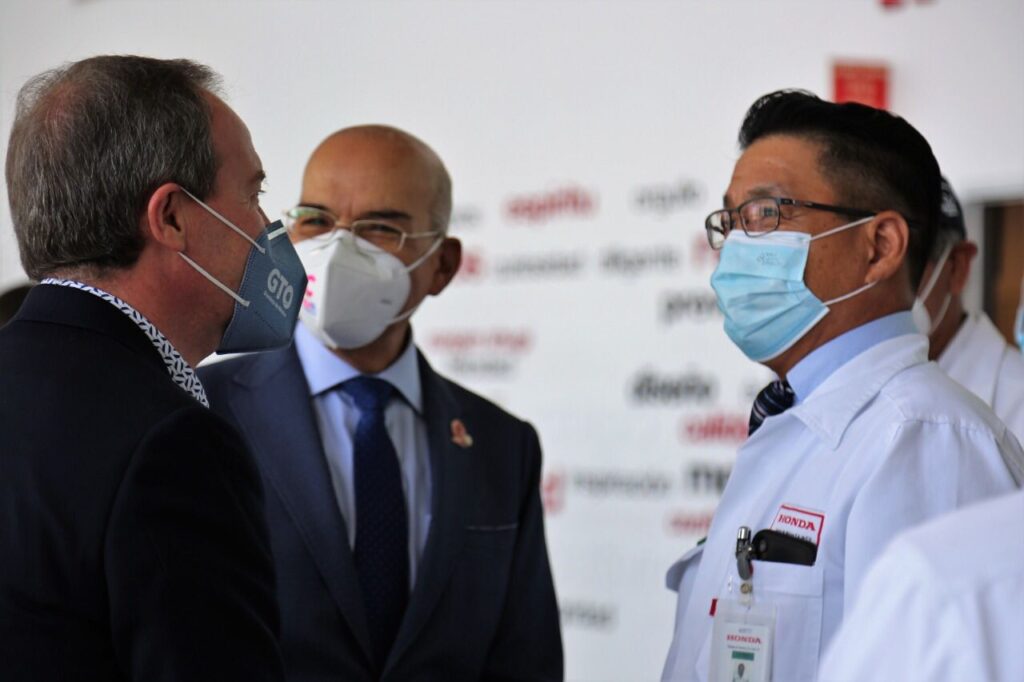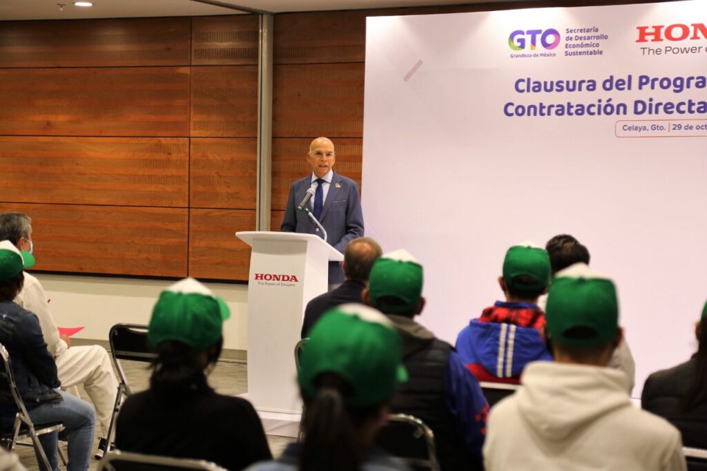 El alcalde estuvo acompañado por el secretario de Desarrollo Económico del Estado, Mauricio Usabiaga; el Secretario del Ayuntamiento, Jorge Gámez; el director de Desarrollo Económico, Eduardo Knapp; el director del IMIPE, Sergio Martínez León, así como directivos de Honda y los trabajadores de nuevo ingreso que lograron concluir con éxito su capacitación de 160 horas en la modalidad 20 por ciento teórico, y 80 por ciento práctico.