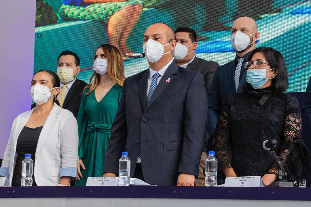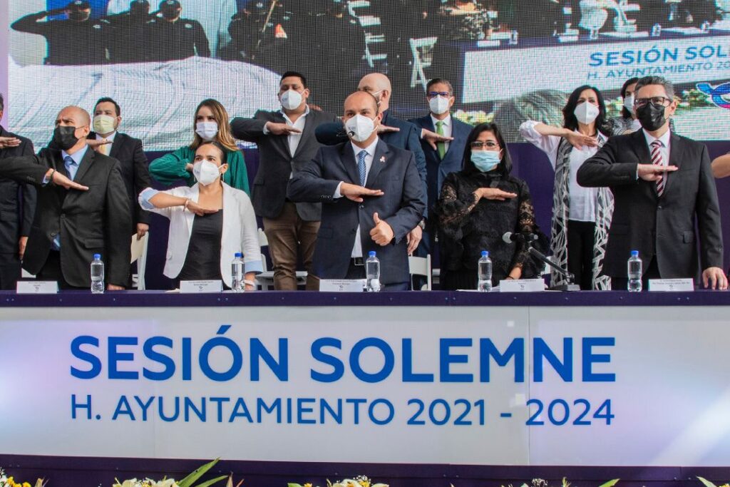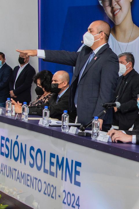 Posteriormente tomo protesta a los miembros del Ayuntamiento 2021-2024 integrado por: sindico Ana Isabel Aguilar Capulín, regidores Luis Martin López Flores, María Andrea Aguilar Oviedo, Eduardo Ojeda Ortiz, María de la Luz Hilda Macías Gasca, Erika Lisette Patiño Martínez, Graciela Martínez Morfin, Carlos Alberto Duran Rivera, Jairo Montero Huichapeño, Roberto Rojas Aguilar y María de la Cruz Mata Medina.