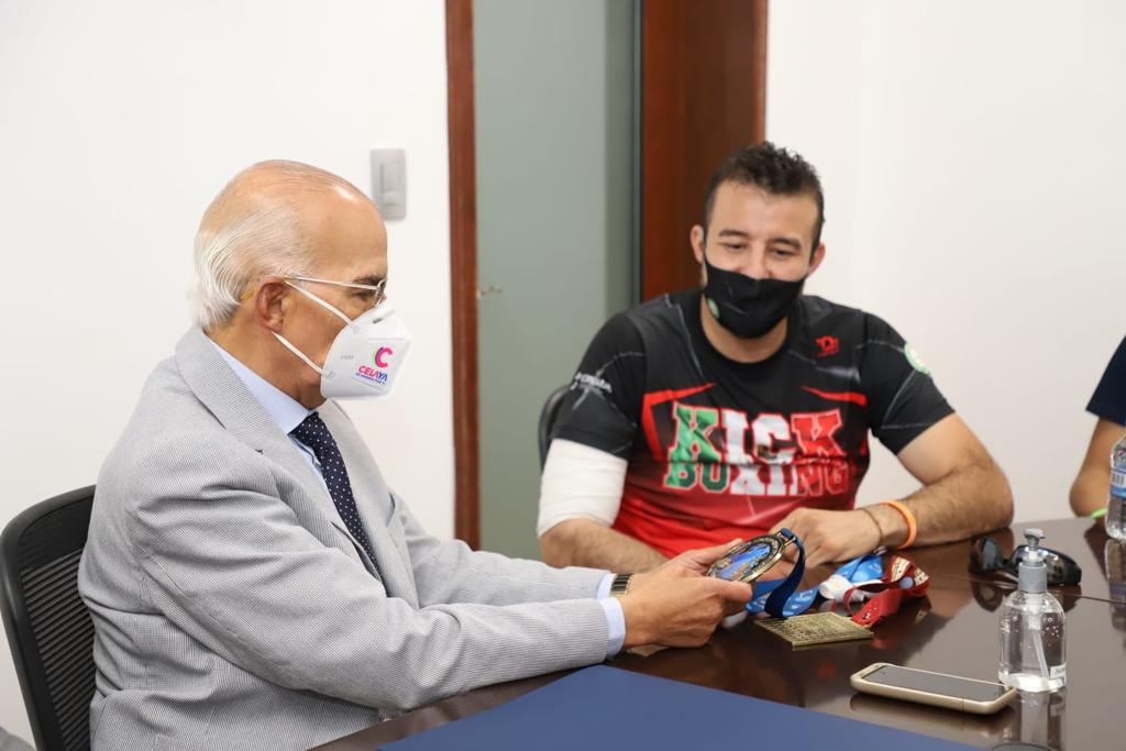 Con el propósito de reconocer al deportista Jorge Ramos, quien ganó la medalla de bronce en Kickboxing en el Campeonato Mundial WACO realizado en Italia, recientemente, el Presidente Municipal de Celaya, Javier Mendoza Márquez, celebró una reunión en sus oficinas, en donde hizo entrega de un diploma al peleador celayense.