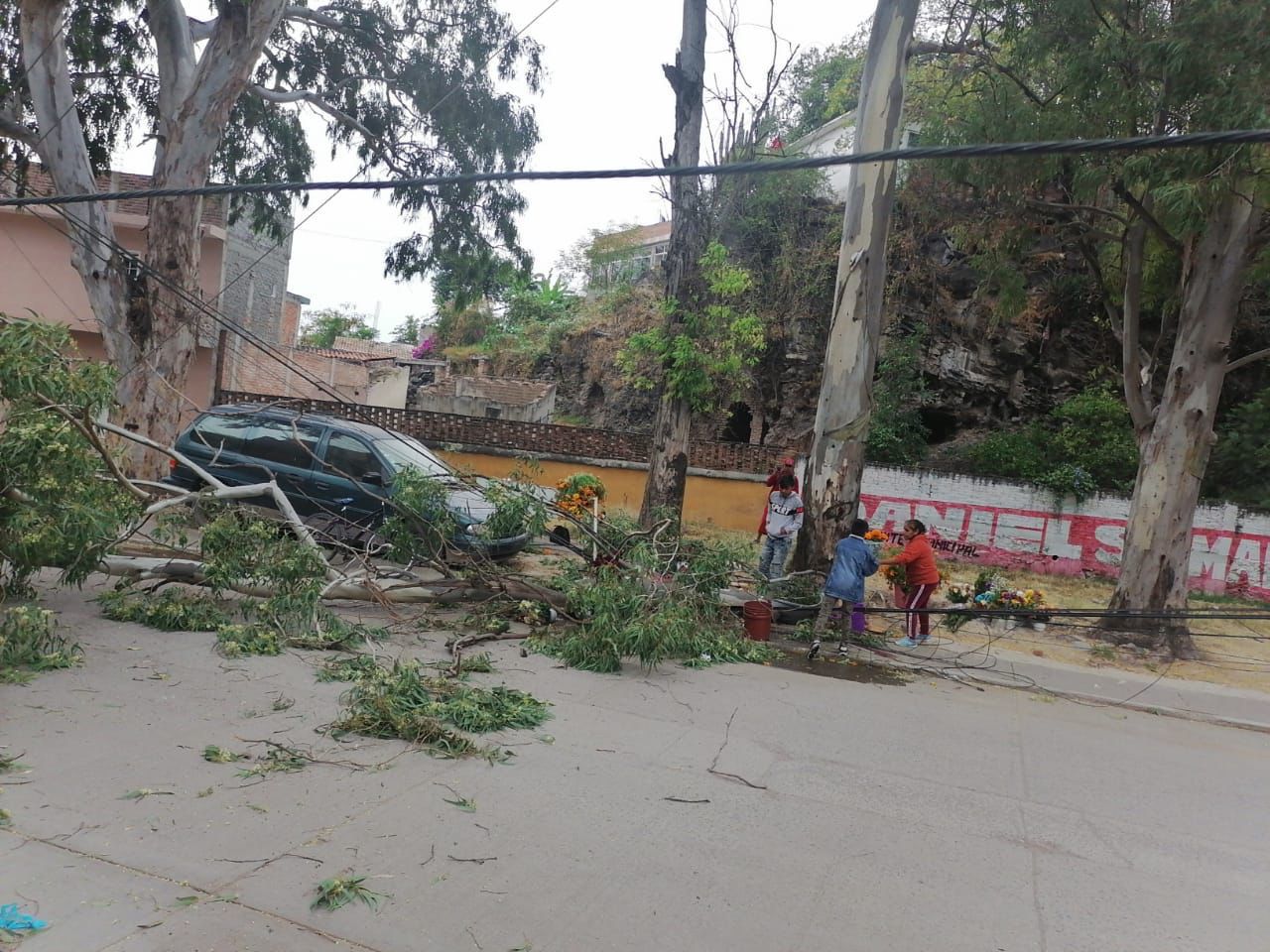 El funcionario mencionó que a consecuencia de un fuerte viento se cayó en dicha calle una rama de un árbol sobre las lineas eléctricas y de Telmex ocasionando la caída de dos postes, daños a un vehículo particular y el bloqueo de la calle.