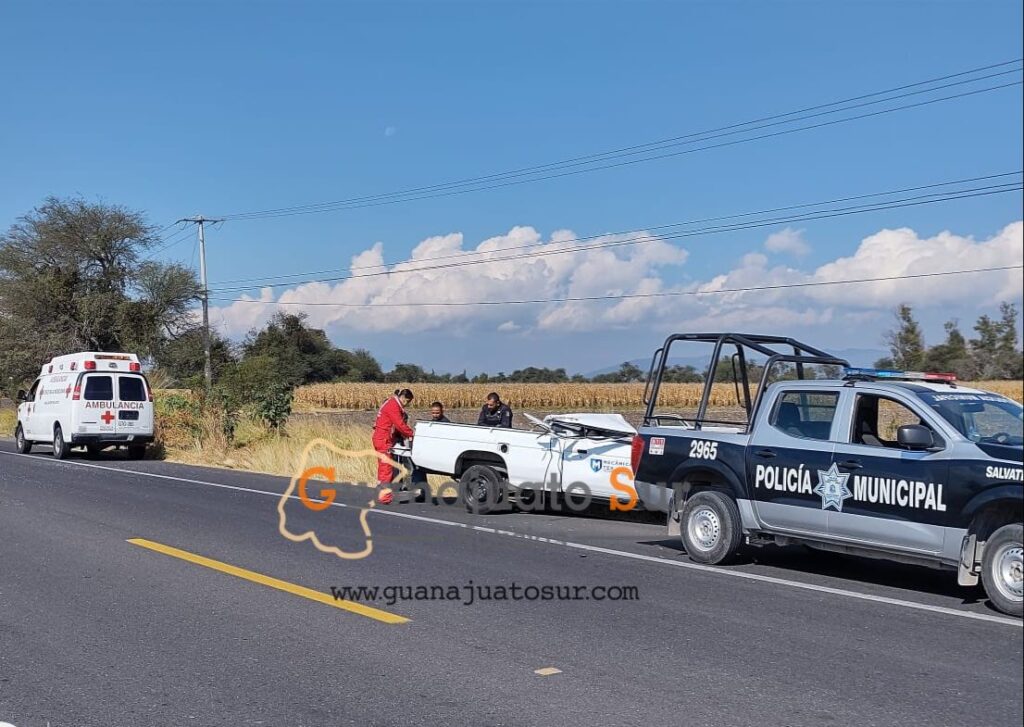 Fue cerca de las 10:00 horas cuando una llamada ingresó al sistema de emergencias 911 para notificar sobre un accidente automovilístico en la carretera Salvatierra-Yuriria donde una camioneta de color blanco sufrió una volcadura quedando totalmente volteada en el asfalto.