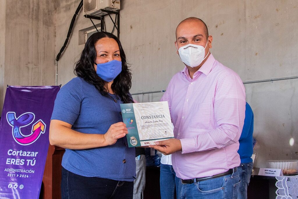 El presidente municipal Ariel Corona entregó certificados a través de la Brigada de Educación para el Desarrollo Rural n°12 para habitantes de la comunidad Colonia de Fuentes, durante la clausura de cursos de repostería y bolsa artesanal.