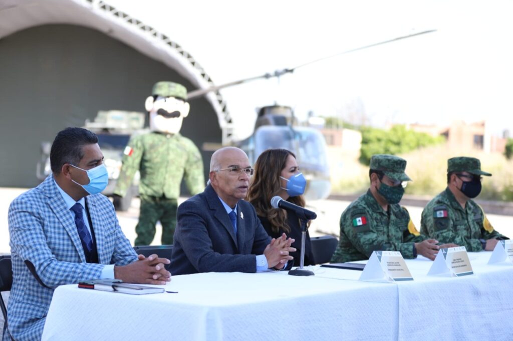 El alcalde Javier Mendoza encabezó la rueda de prensa, acompañado por la secretaria de gobierno del Estado de Guanajuato, Libia Denise García; el comandante del Ejército Williams Conrady Chavarría; el general de brigada Sergio Ángel Sánchez García y el secretario de seguridad ciudadana, Jesús Rivera Peralta.