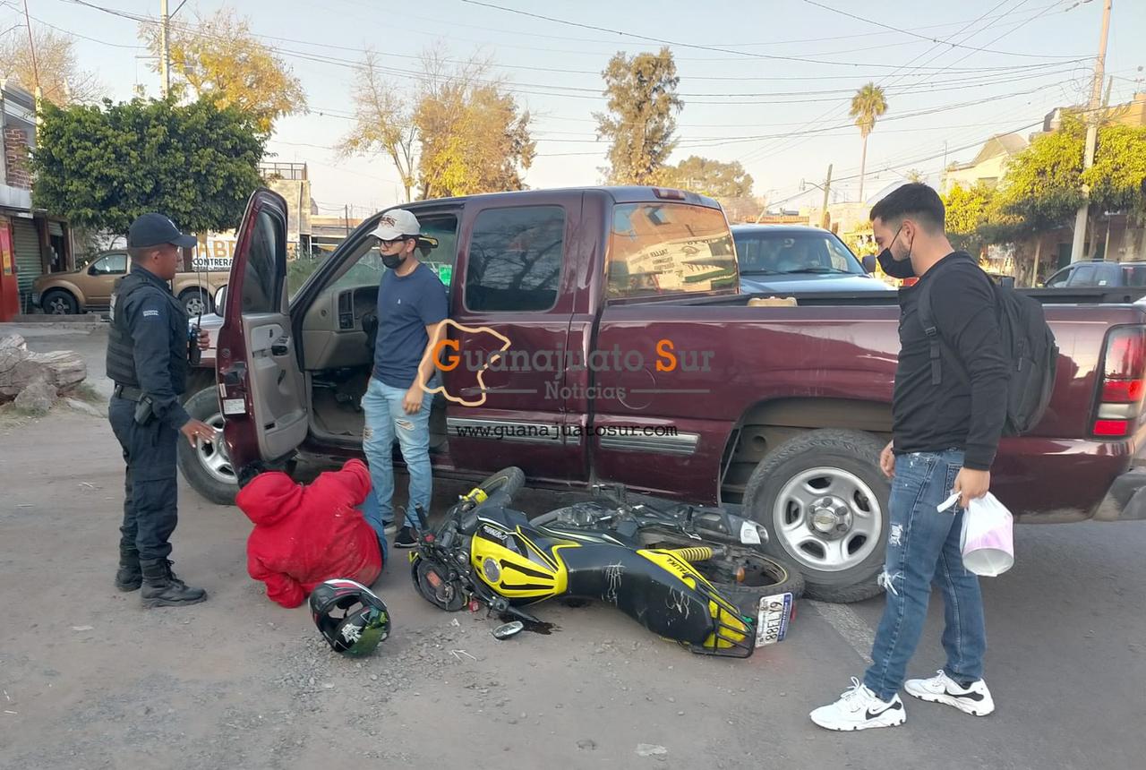 Destaca que a unos metros de donde se registró el accidente se encontraba una unidad de policía, por lo que los elementos llegaron de inmediato al lugar. En el incidente se vieron implicados una camioneta tipo Pick Up color guinda y una motocicleta Italika FT200 color amarillo con negro con placas de Guanajuato.
