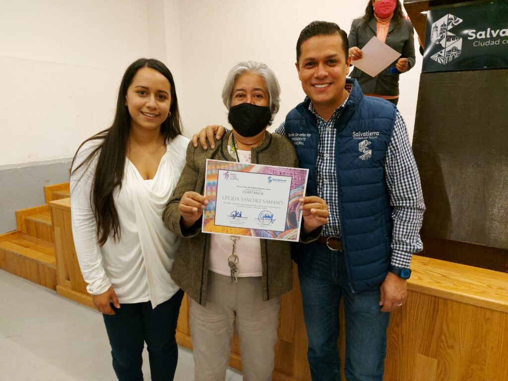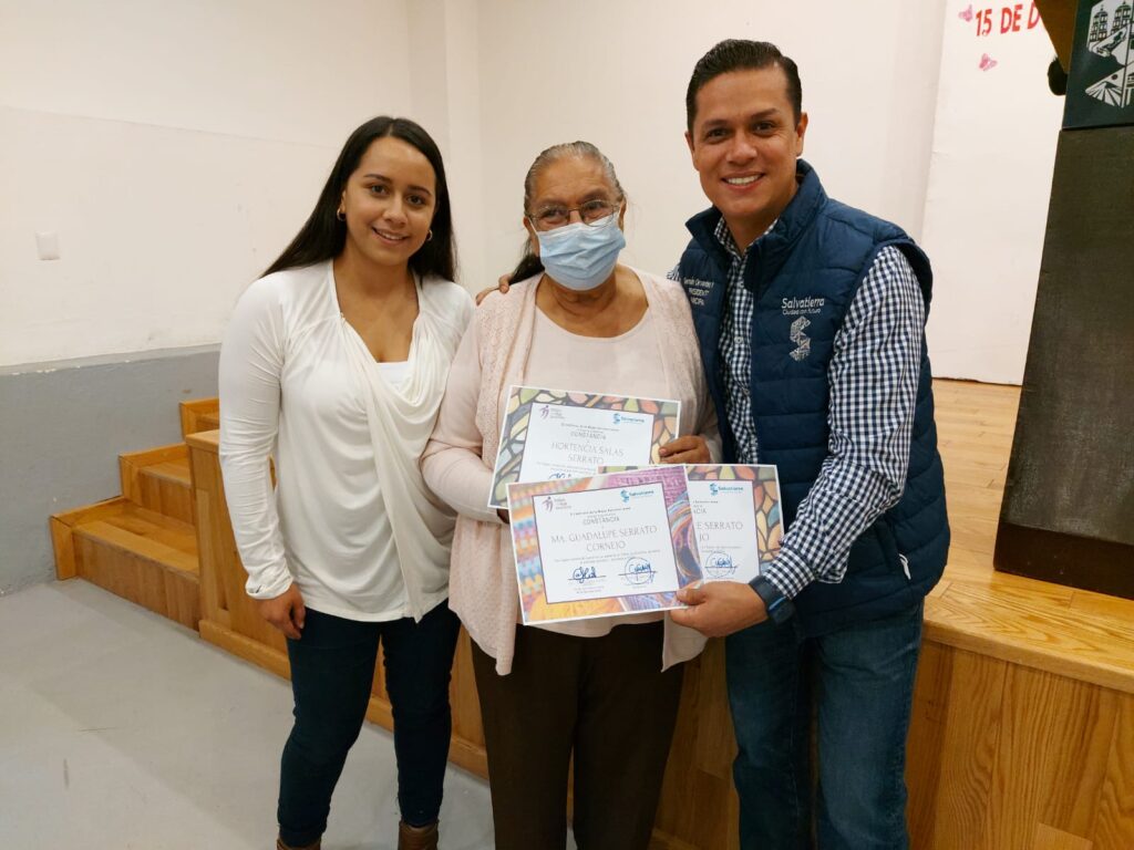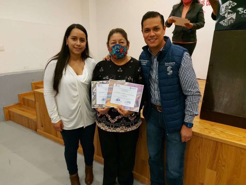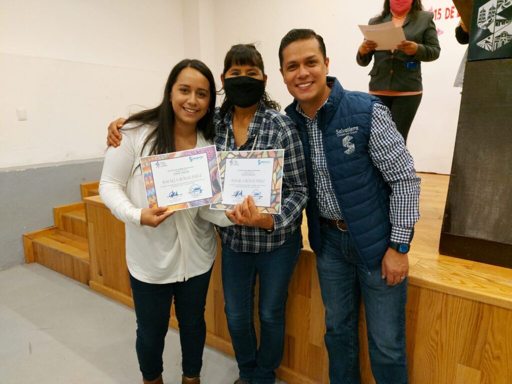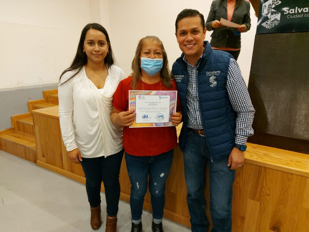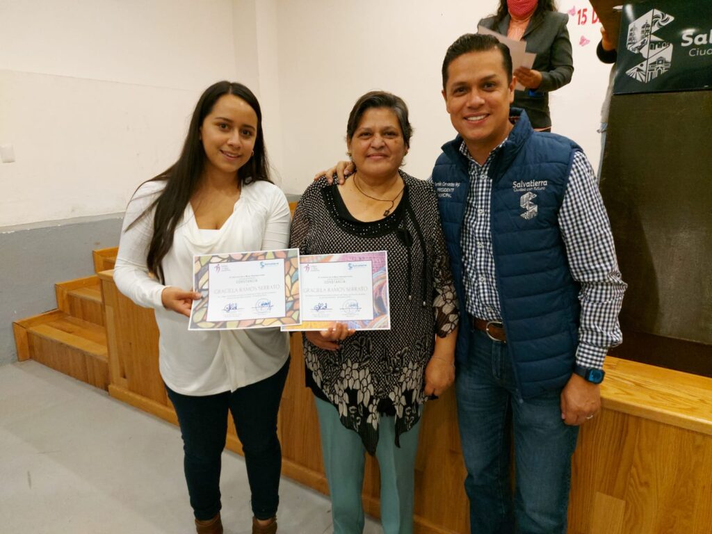 El Presidente Municipal Germán Cervantes Vega en compañía de la Directora del Instituto de la Mujer Gema Andrea Patiño Herrera realizaron la entrega de constancias a 56 mujeres que concluyeron sus cursos de elaboración de jabón artesanal, figuras de crochet y piezas de vitromosaico los cuales fueron brindados por la maestra Emma Rosas del mes de octubre a diciembre.