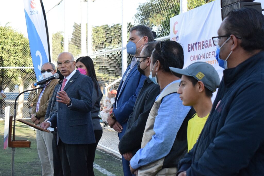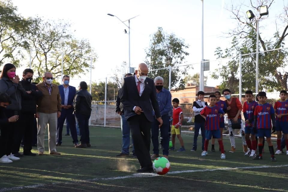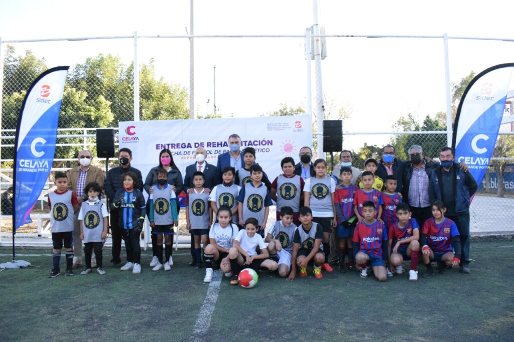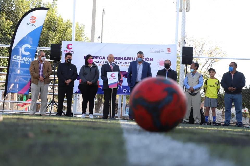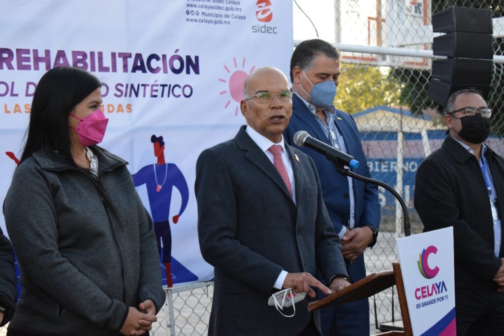 La tarde de este martes, el presidente municipal, Francisco Javier Mendoza Márquez, asistió a dicha entrega de la rehabilitación de la cancha de fútbol, señalando que esto es parte de los trabajos en pro del deporte celayense para lograr la reconstrucción del tejido social.
