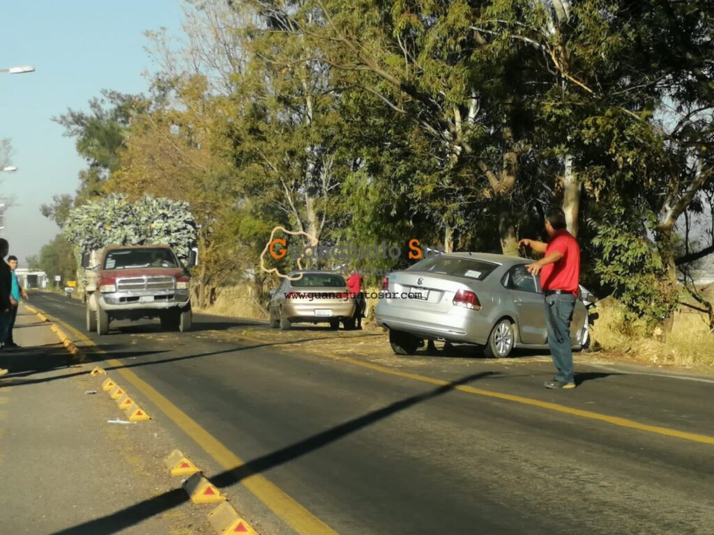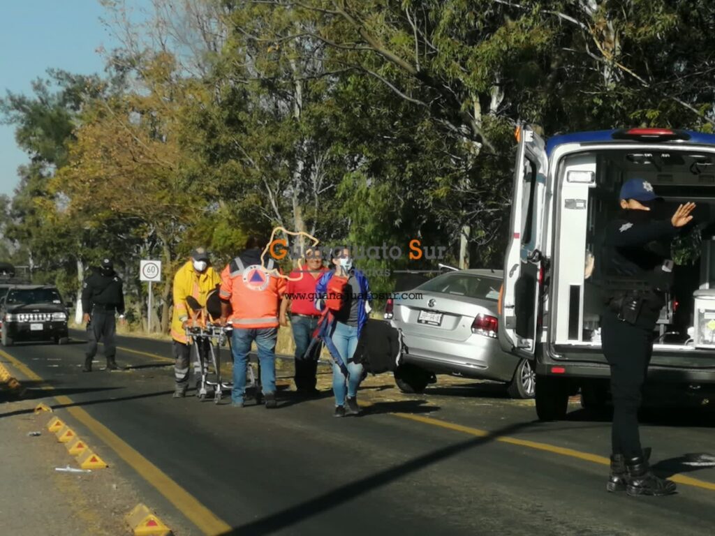Fue localizado un vehículo tipo Vento de la marca Volkswagen sufrió daños en la parte delantera y del lado del copiloto. Paramédicos de Protección Civil de Tarimoro arribaron al lugar para brindarle los primeros auxilios a los tripulantes del auto, trasladándolos a recibir una mejor valoración médica a un hospital de la región donde se reportan como estables de salud.