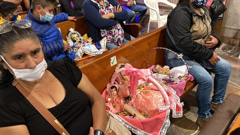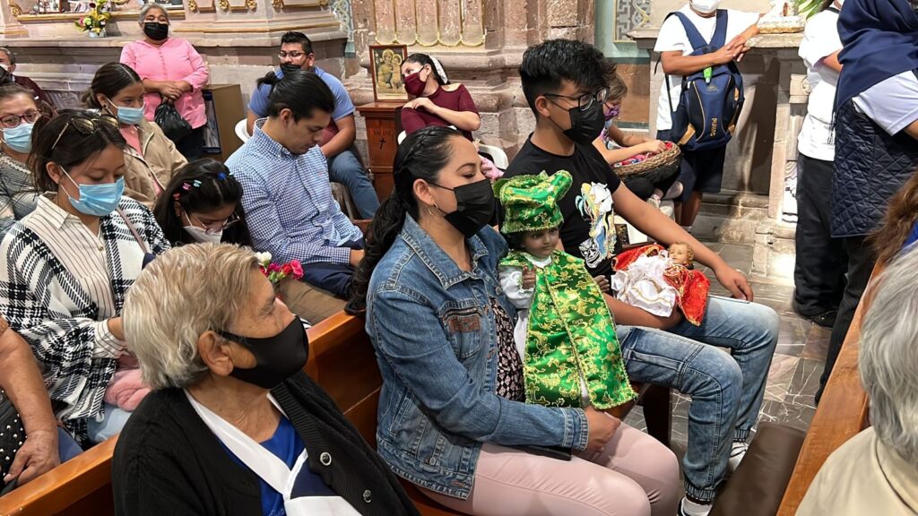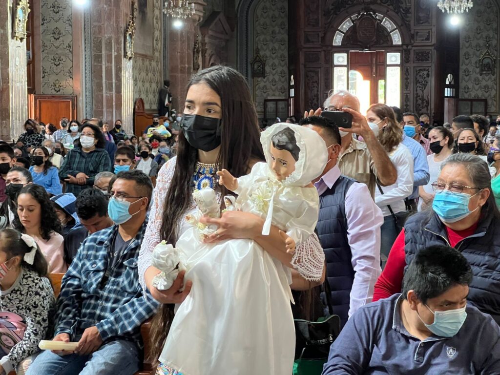 La señora Jimena Rodríguez llevó a bendecir sus dos imágenes del niño Jesús, y de igual manera vistió con el mismo atuendo a su hijo de siete meses de edad para recibir la bendición.