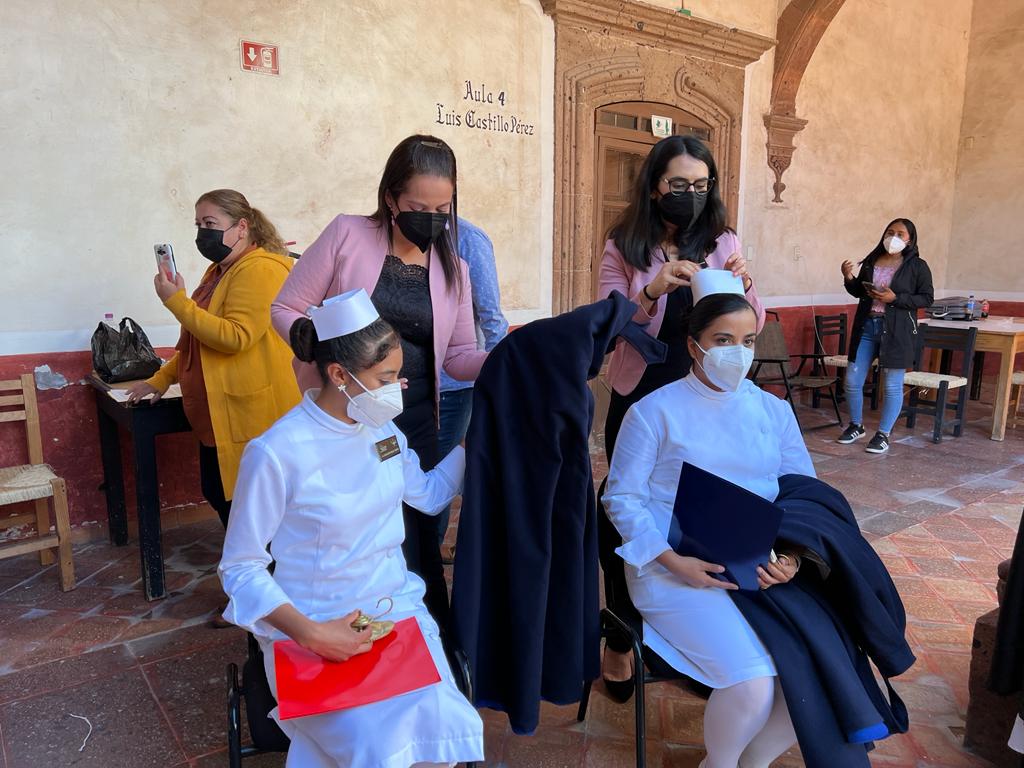 Posteriormente las mujeres egresadas pasaron de una a una a realizar la imposición de capa que simboliza el peso y la responsabilidad que ahora tienen como enfermeras y la cofia que representa dignidad, amor al prójimo, cuidado, servicio y lealtad a la profesión; mientras que a los varones les fueron colocados sacos.