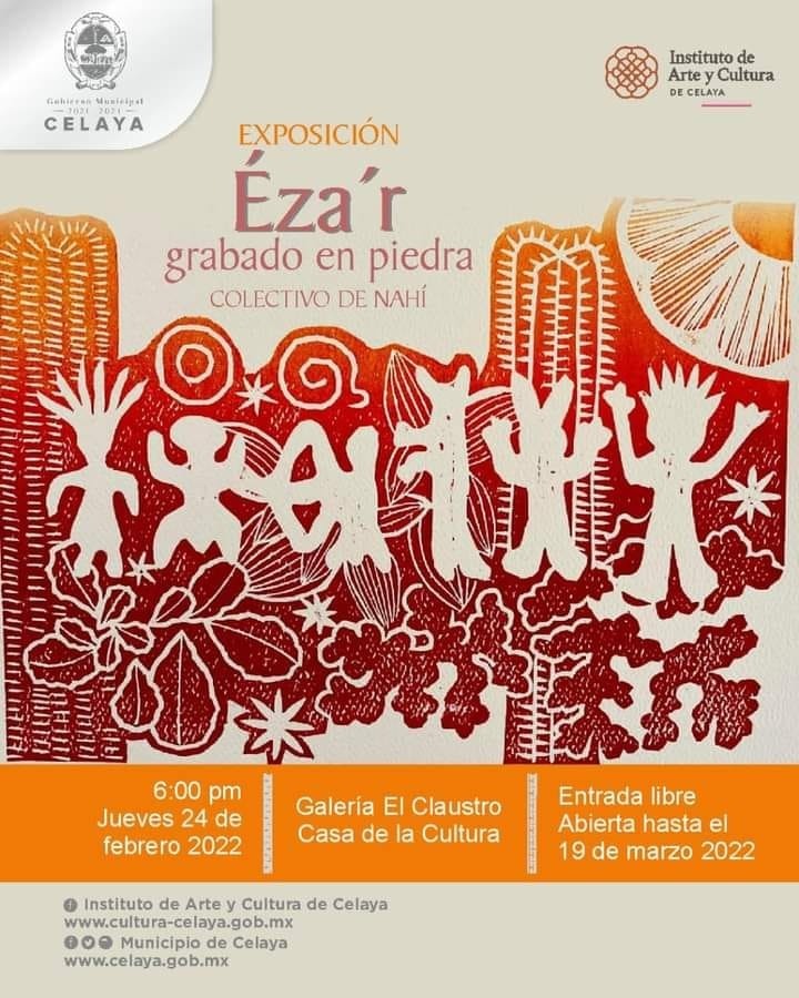 De igual manera este jueves 24 de febrero, a las 18:00 horas, se llevará a cabo la inauguración de la exposición Éza’r, grabado en piedra, a cargo del Colectivo de Nahí, en la galería El Claustro de Casa de la Cultura.