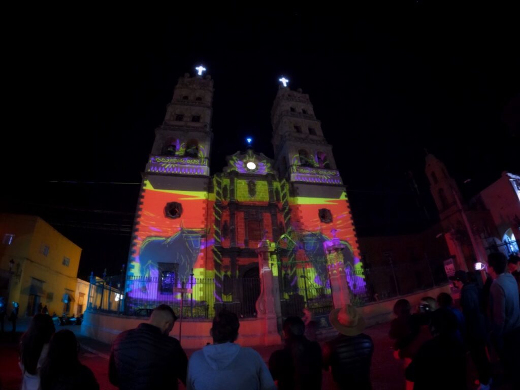 Al finalizar el recorrido se llevó a cabo la proyección del video mapping en la facha de la Parroquia de la Luz y un espectáculo de juegos pirotécnicos.