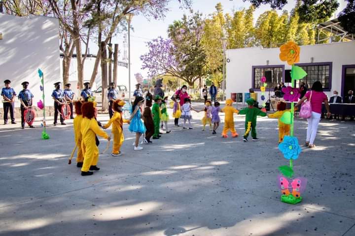 Autoridades municipales, alumnos, personal docente y padres de familia del preescolar “Indira Gandhi” participaron en el acto cívico por el aniversario 216 del natalicio de Benito Juárez y el inicio de la primavera, que se desarrolló en la explanada del Centro Cultural.