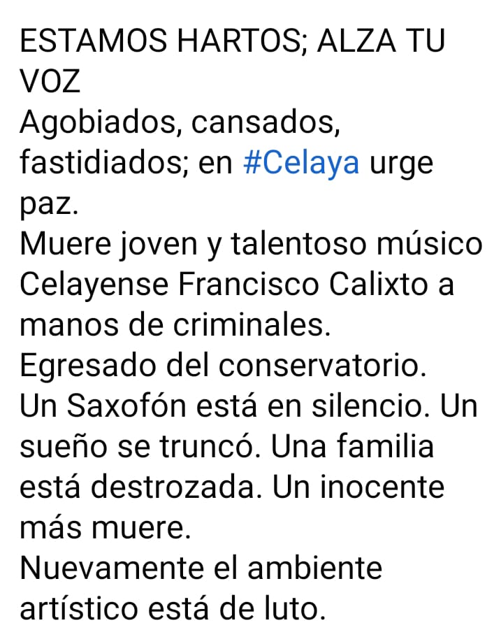 En redes sociales, conocidos del saxofonista, salsero, pintor y fotógrafo quien era egresado del Conservatorio de Celaya comienzaron a mostrar su indignación y justicia por el asesinato.