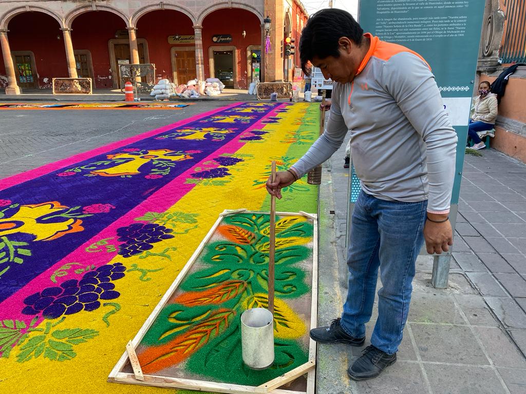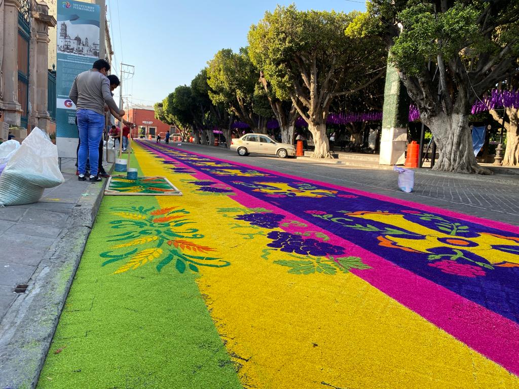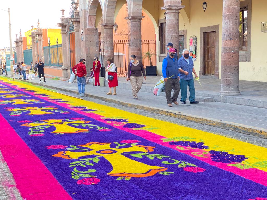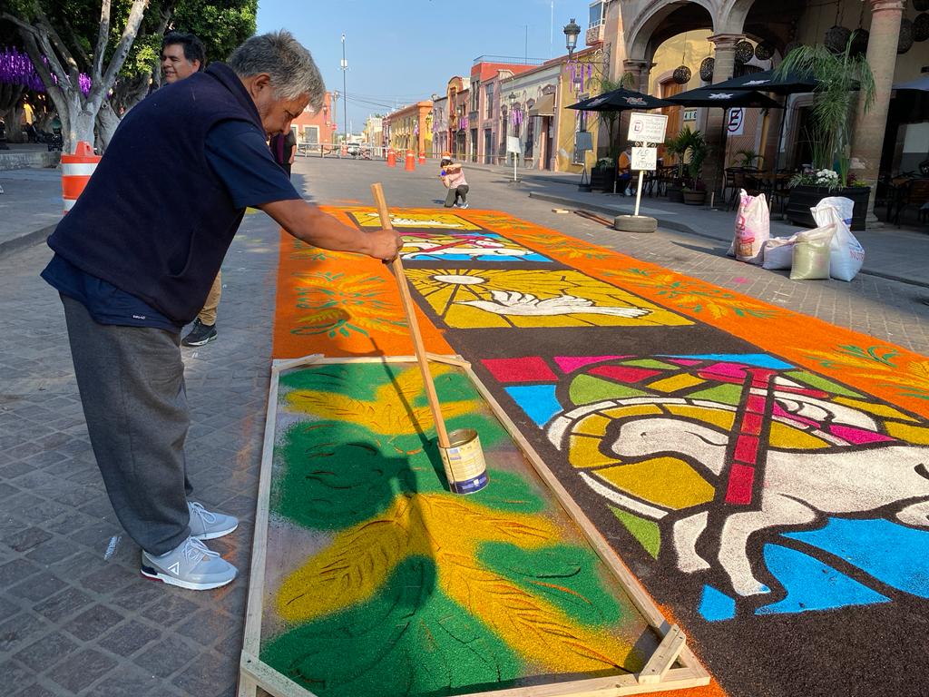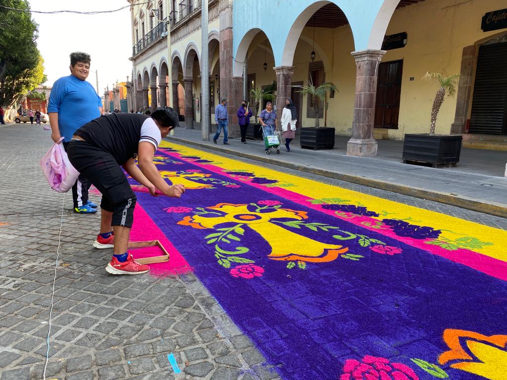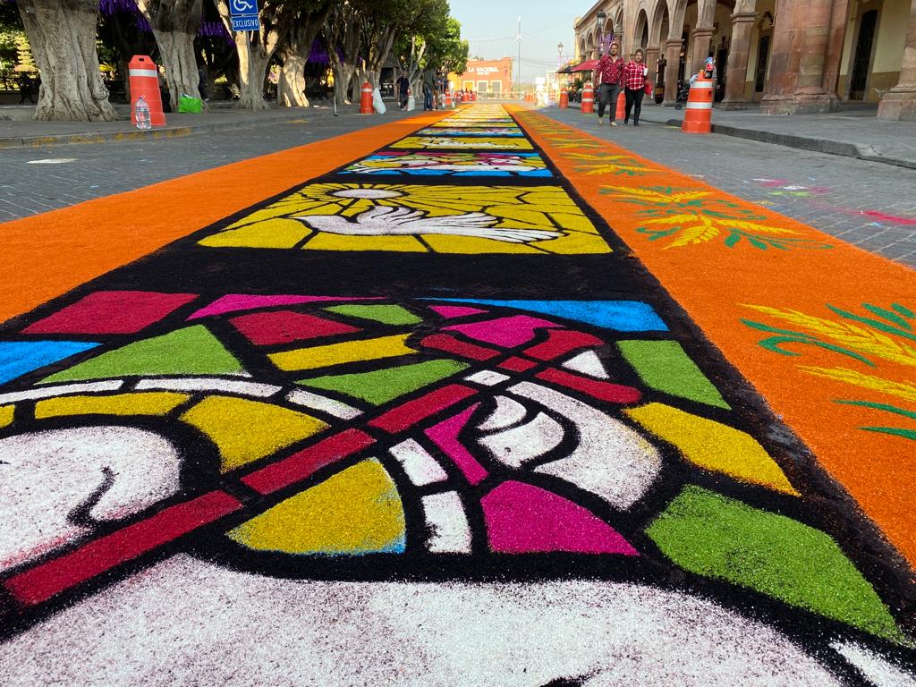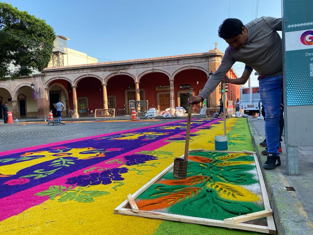 Como parte del programa de eventos de Semana Santa en el pueblo mágico de Salvatierra dos de las calles más importante se llenaron de color con tapetes que lucen iconografía tradicional de temporada, para que locales y visitantes disfruten de una tradición traída desde Huamantla, Tlaxcala.