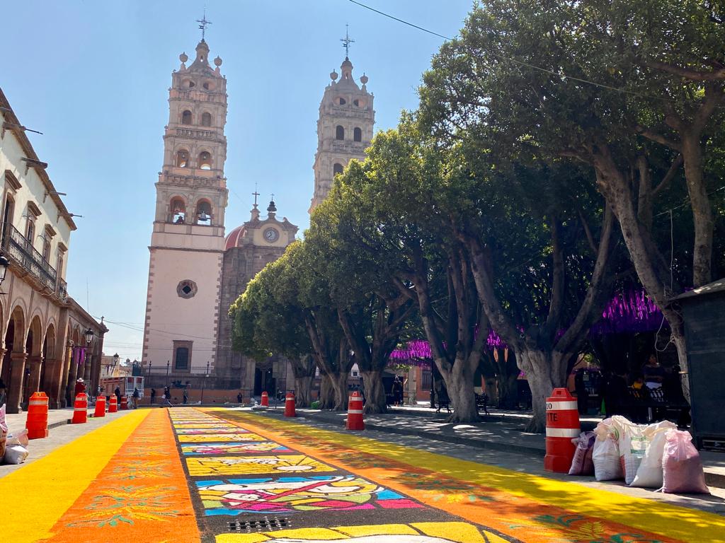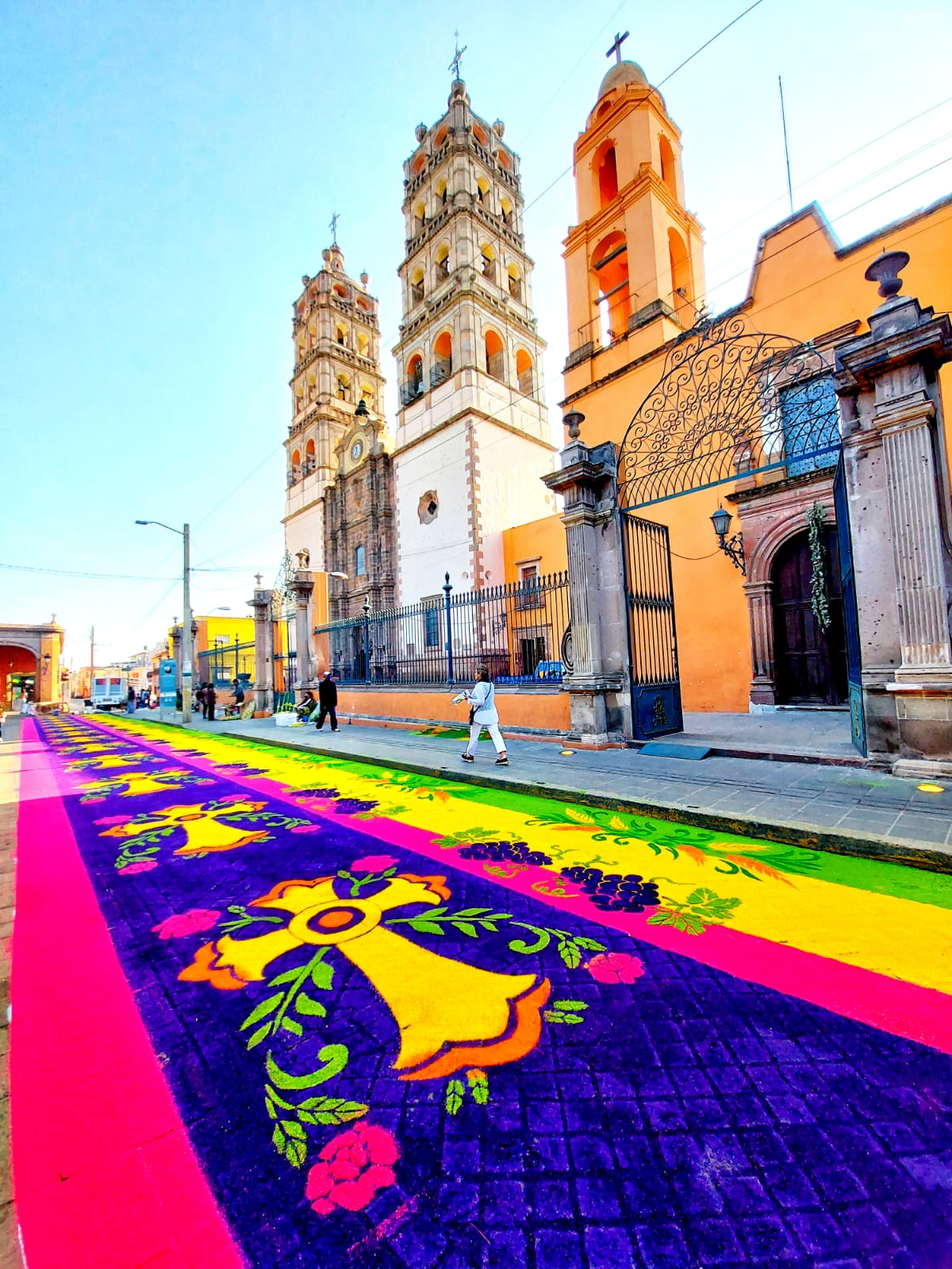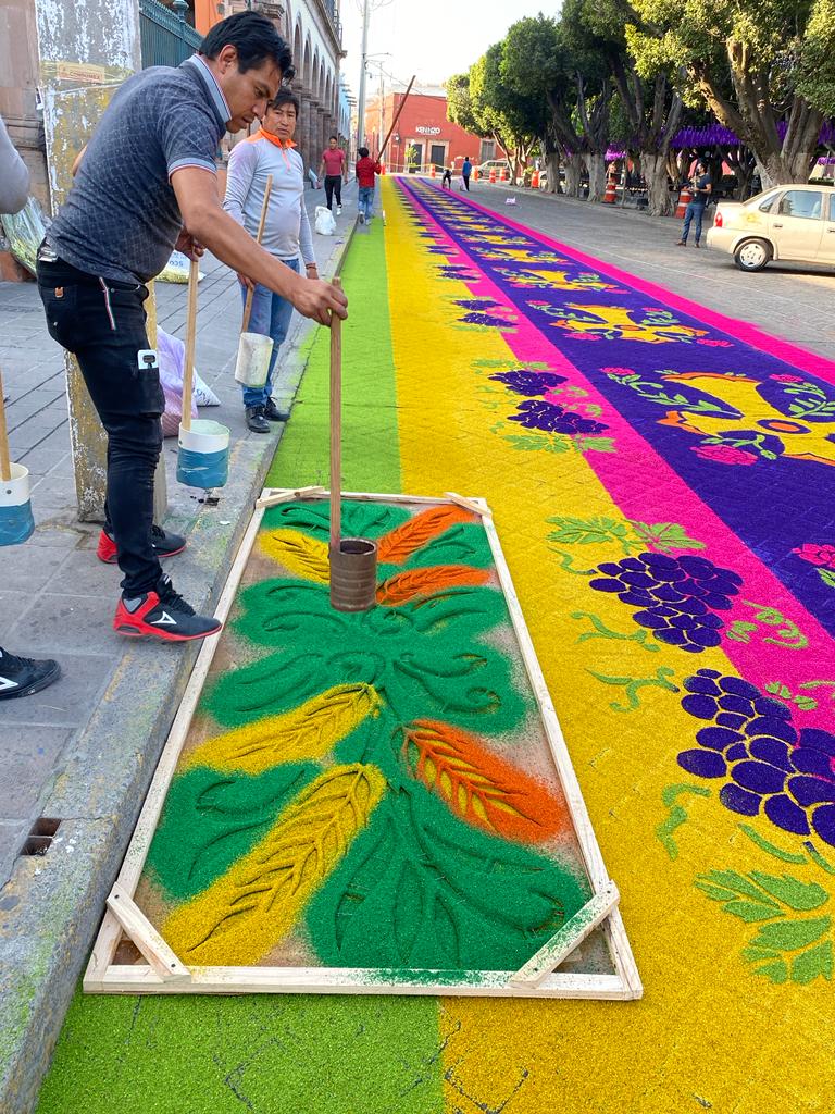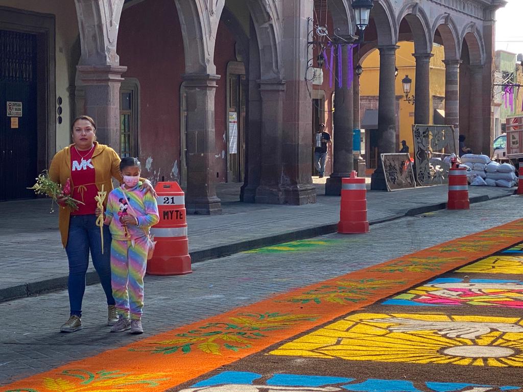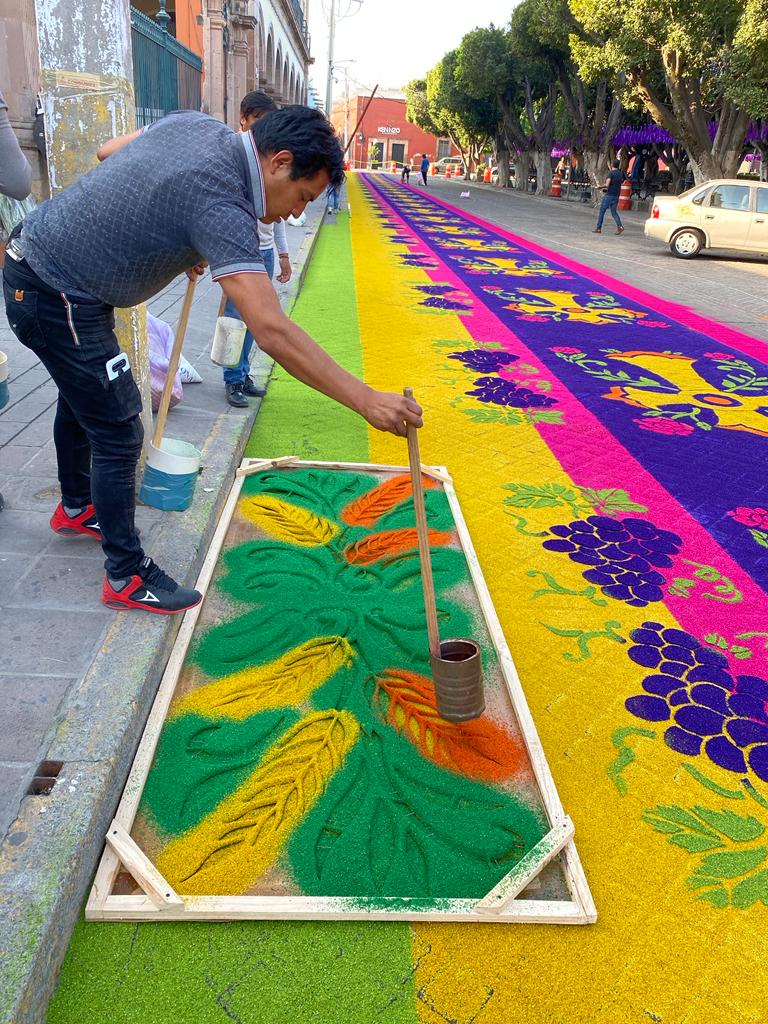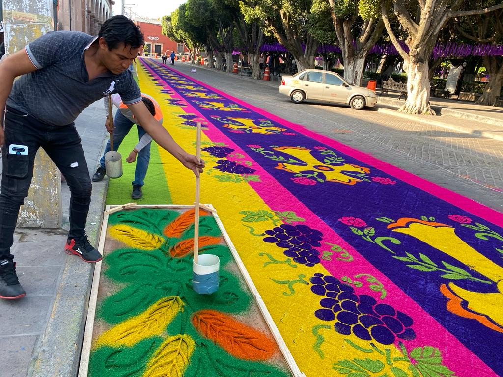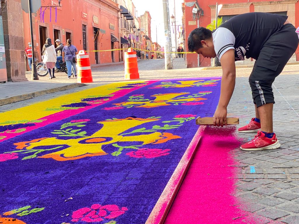 Como parte del programa de eventos de Semana Santa en el pueblo mágico de Salvatierra dos de las calles más importante se llenaron de color con tapetes que lucen iconografía tradicional de temporada, para que locales y visitantes disfruten de una tradición traída desde Huamantla, Tlaxcala.