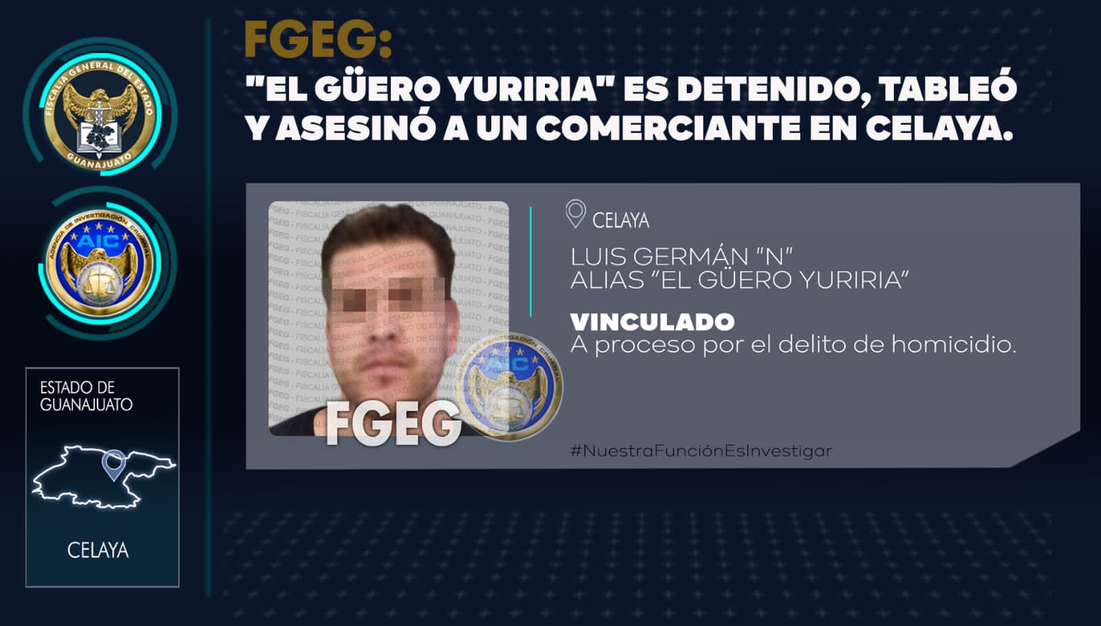Agentes de Investigación Criminal de la Región «C» detuvieron a Luis Germán «N» alías «El Güero Yuriria», inculpado por el homicidio de Blas «N» de 44 años de edad.
