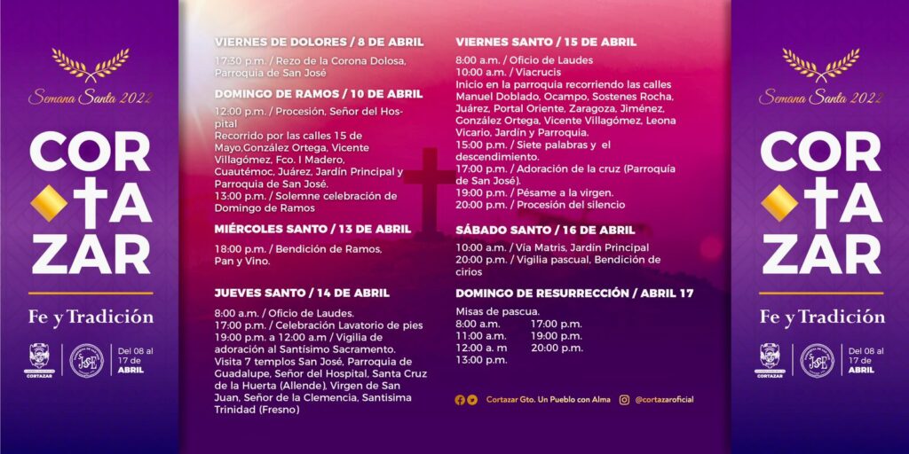 Autoridades municipales y representantes de la Parroquia de San José trabajan por primera vez en conjunto para promover el turismo religioso e impulsar la reactivación económica, por ello presentaron el programa de actividades de Semana Santa 2022 “Cortazar Fe y Tradición”, con el que se busca retomar las actividades religiosas presenciales y reactivar la economía de los artesanos y comerciantes de temporada.