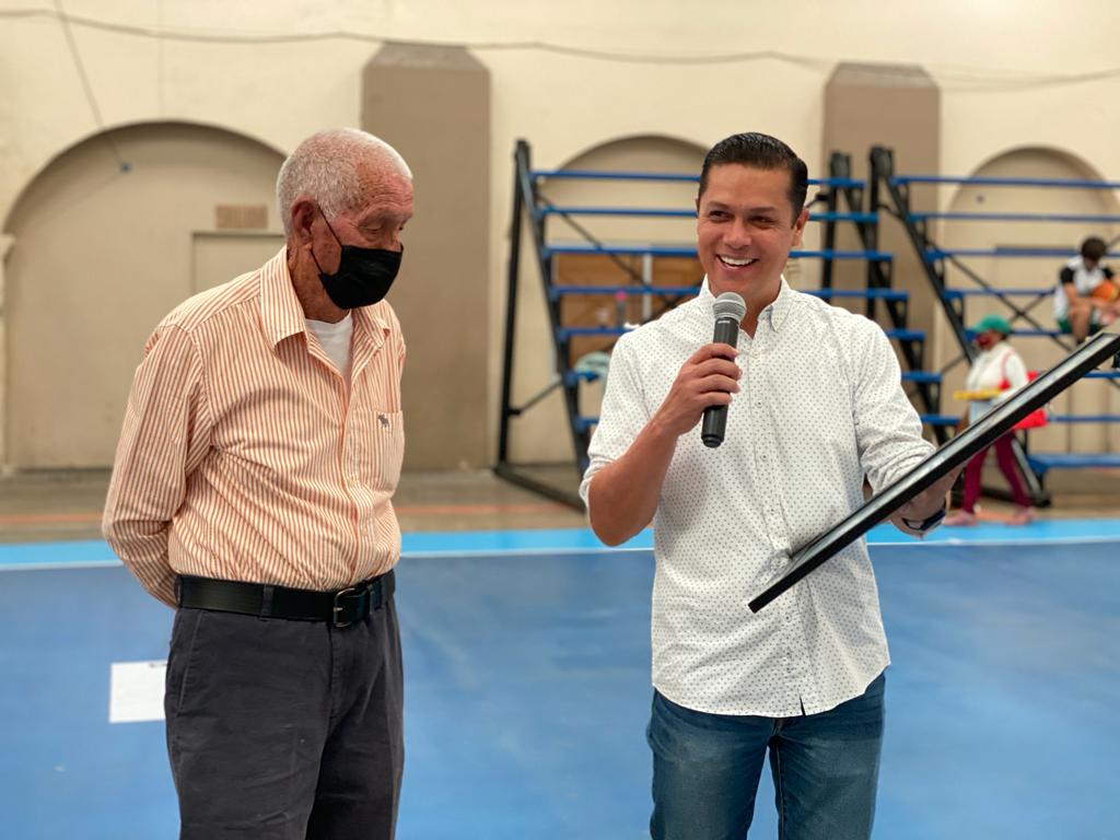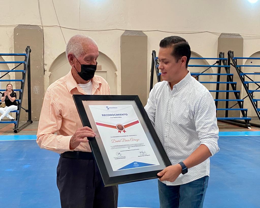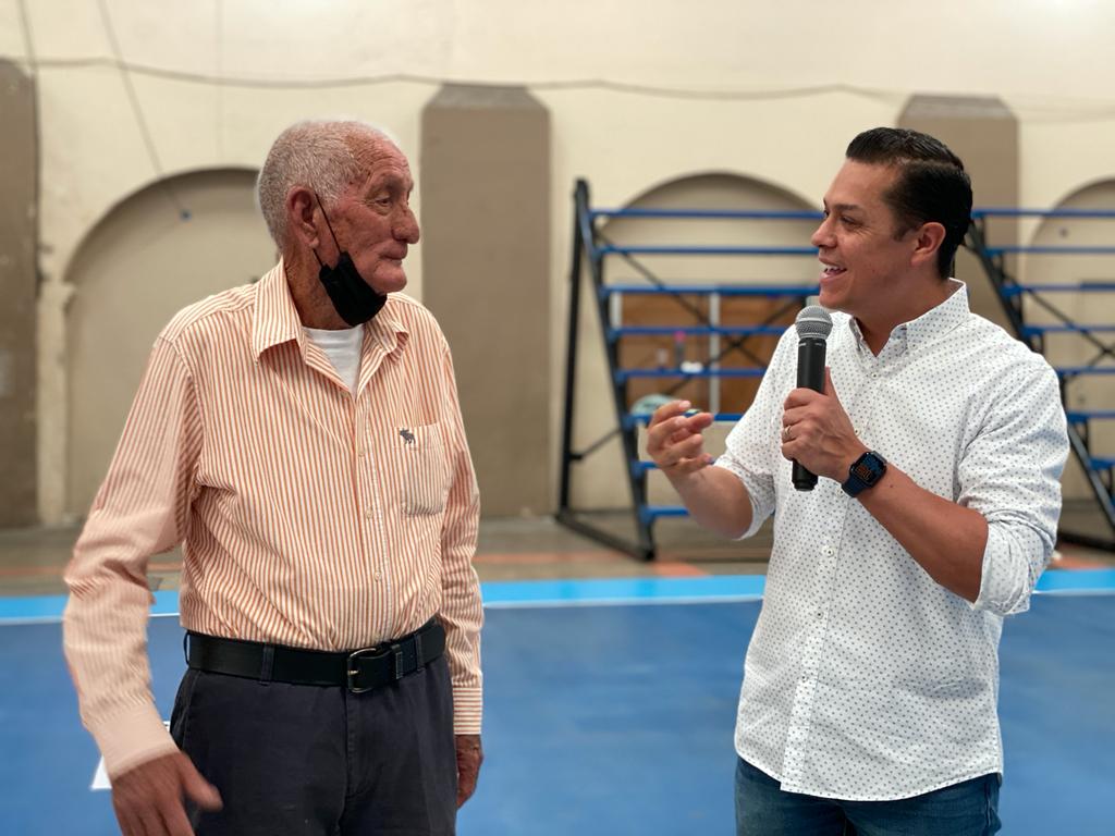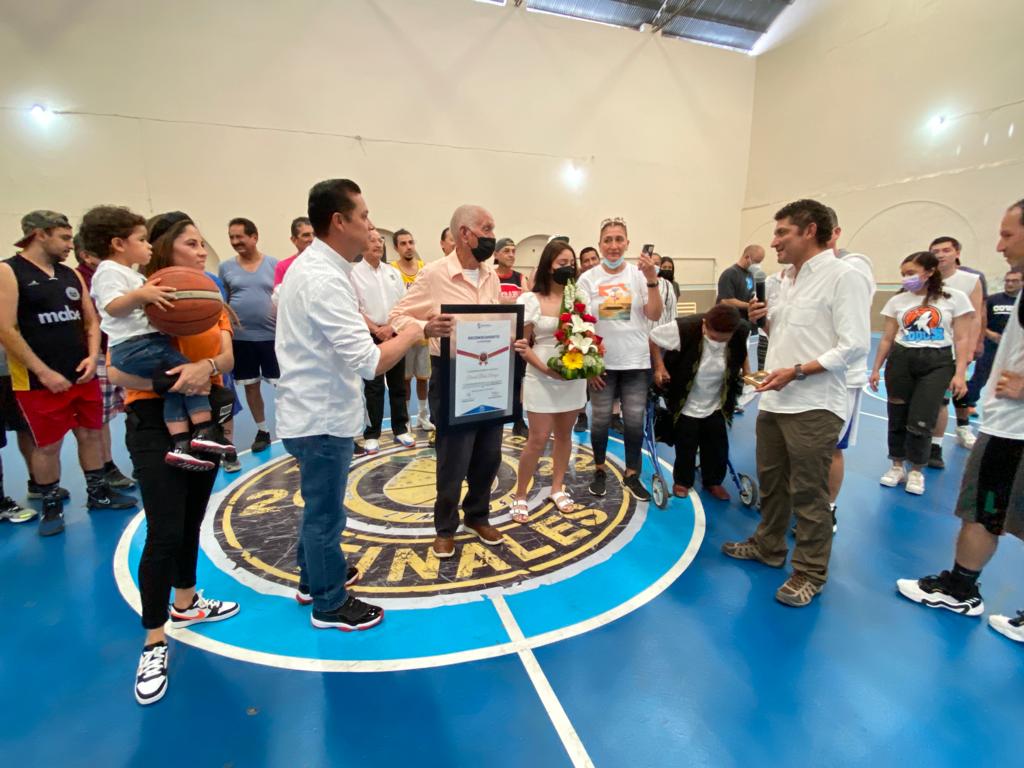Germán Cervantes Vega, presidente municipal de Salvatierra, entregó un reconocimiento a David Baca Arroyo mejor conocido como “el viejo”, por sus más de 60 años de trayectoria como basquetbolista y fundador del auditorio deportivo.