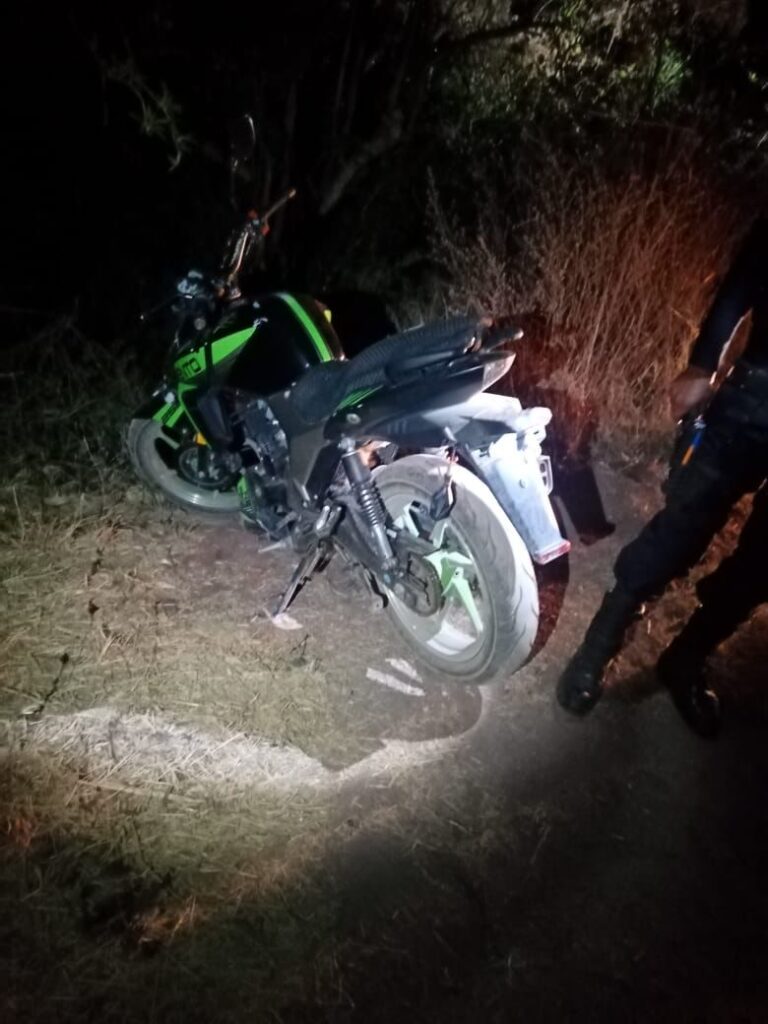 Así mismo al continuar con la operatividad para la disuasión de diversos delitos y faltas, siendo aproximadamente las 04:00 horas ya del día 10 de Abril, al realizar recorridos de seguridad en la colonia El cerrito de este municipio se tiene a la vista una una motocicleta marca Ventó, línea Tornado, en color verde, tripulada por una persona del sexo masculino quien al notar la presencia policial desciende de la motocicleta y emprende huida a pie internándose entre la maleza, por lo que se consulto en la base de datos la serie de dicha motocicleta teniendo como resultado que cuenta con reporte de robo en fecha 08 de Abril de 2022.