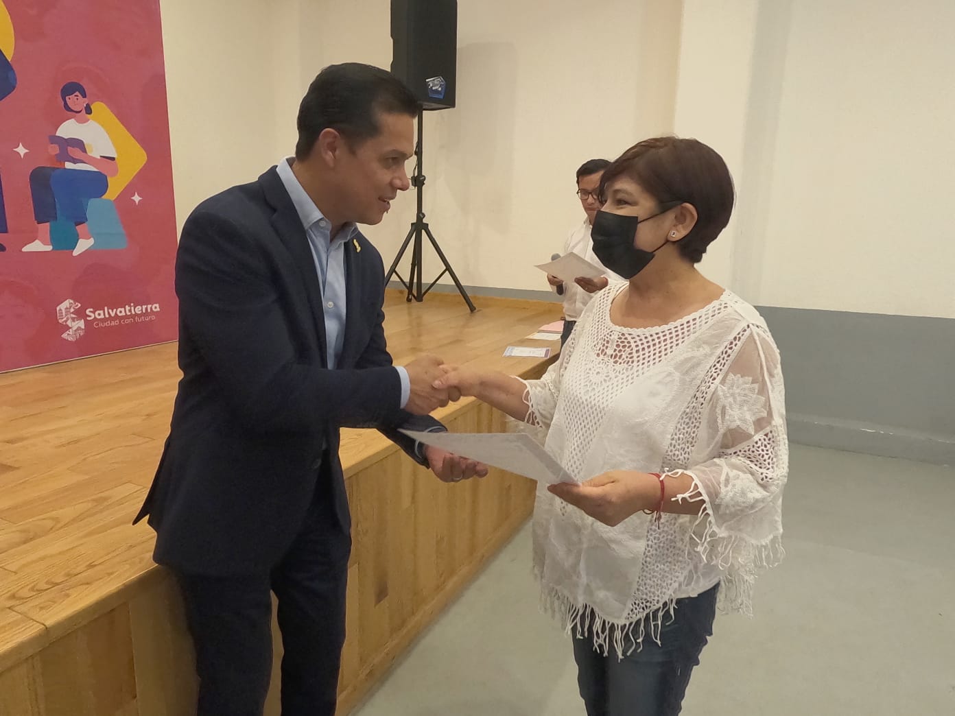 En el evento de entrega de Constancias estuvo presente Germán Cervantes Vega, Presidente Municipal de Salvatierra en compañía de Gema Patiño Herrera, titular del Instituto de la Mujer Salvaterrense.