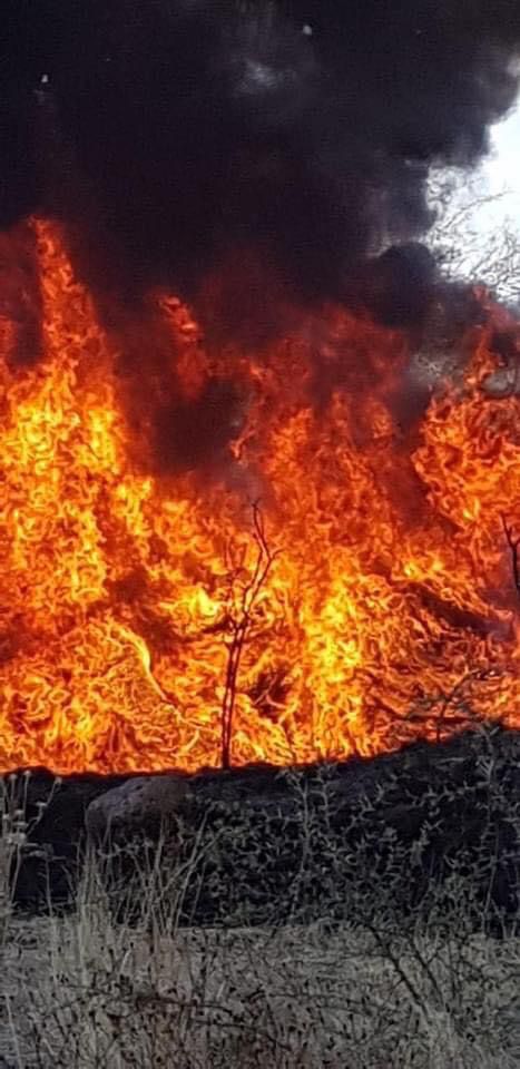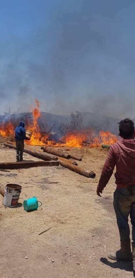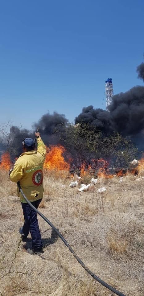Posteriormente el cuerpo de bomberos voluntarios acudió para brindar apoyo debido a la expansión del incendio que alcanzó alrededor de 60 llantas de vehículo y afectó una bodega de equipos de perforación de pozos en la salida al Acebuche.