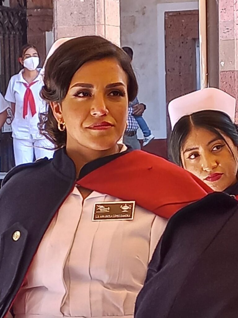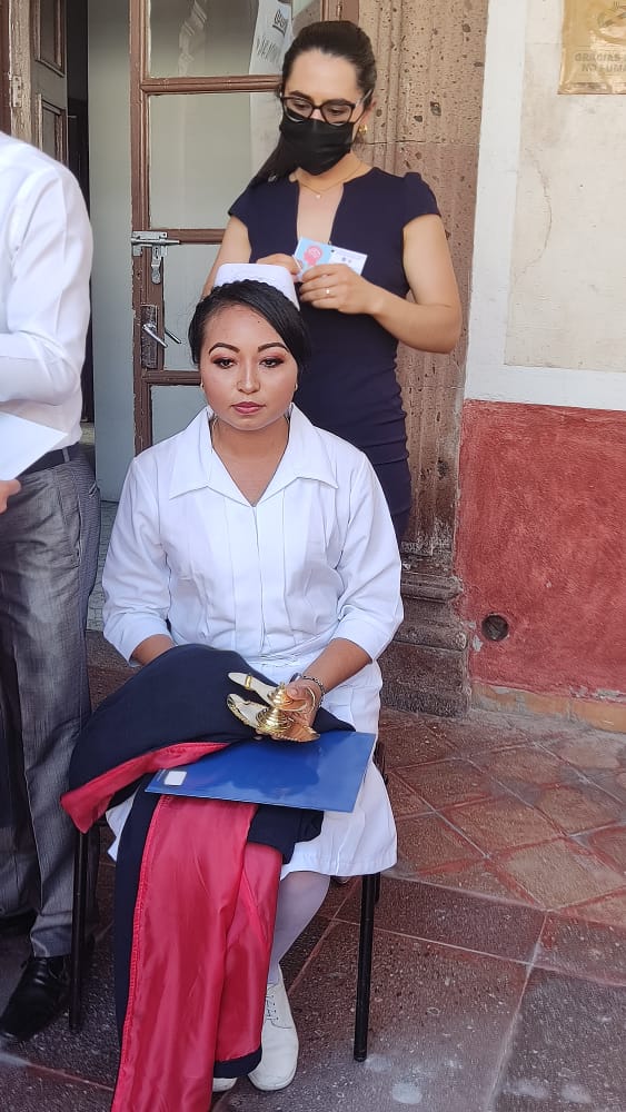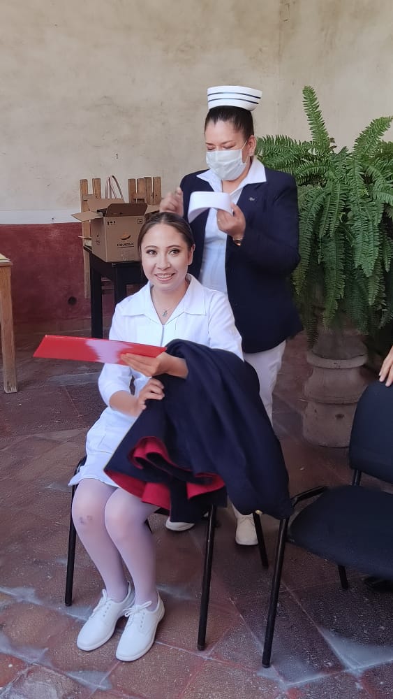 Posteriormente las mujeres egresadas pasaron de una a una a realizar la imposición de capa que símboliza el peso y la responsabilidad que ahora tienen como enfermeras y la cofia que representa dignidad, amor al prójimo, cuidado, servicio y lealtad a la profesión; mientras que a los varones les fueron colocados sacos.