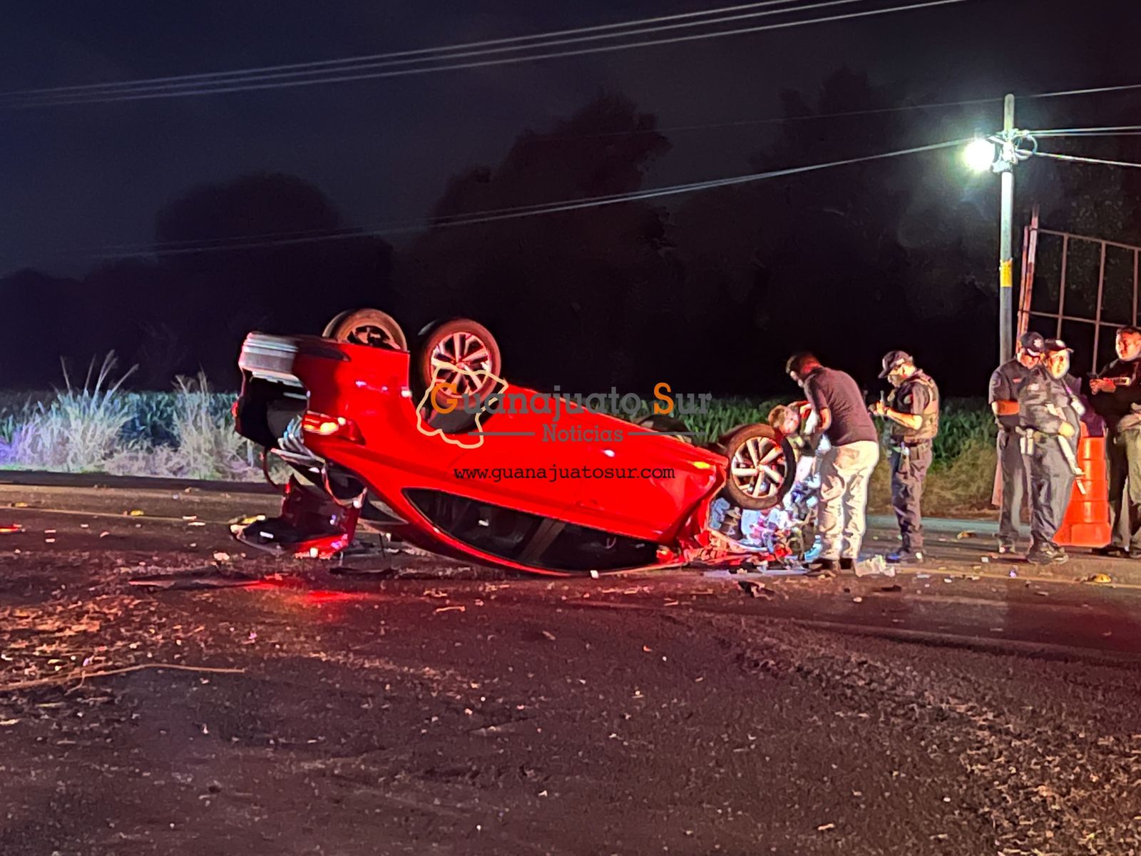Se recibió un reporte al rededor de las 23:00 horas del pasado sábado 11 de junio sobre un accidente vehicular tipo choque en la carretera Salvatierra Yuriria acudiendo al lugar de los hechos policías municipales quienes localizaron un vehículo color rojo volteado y una camioneta blanca con un fuerte golpe en la parte trasera.