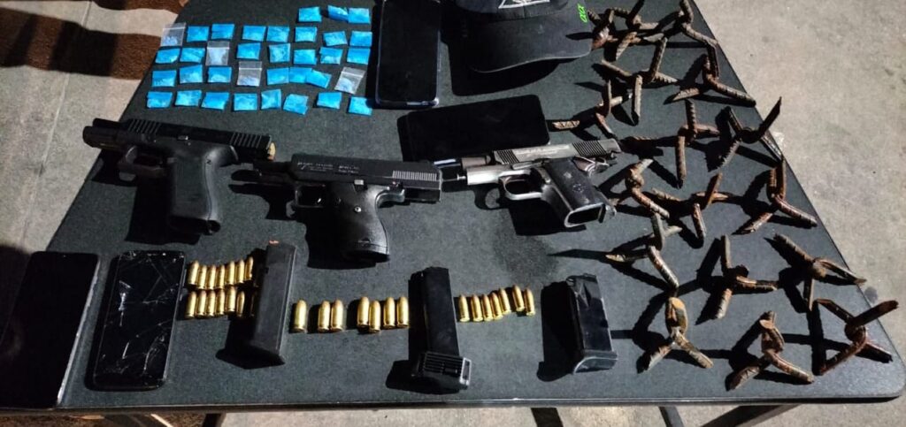 Al revisar el vehículo marca Toyota Tacoma, modelo 2014, color gris, arrojó reporte de robo con fecha del 6 de julio de este año, además se les encontraron tres armas cortas, dos de calibre 9 milímetros y una calibre .45, abastecidas con un total de 29 cartuchos útiles.