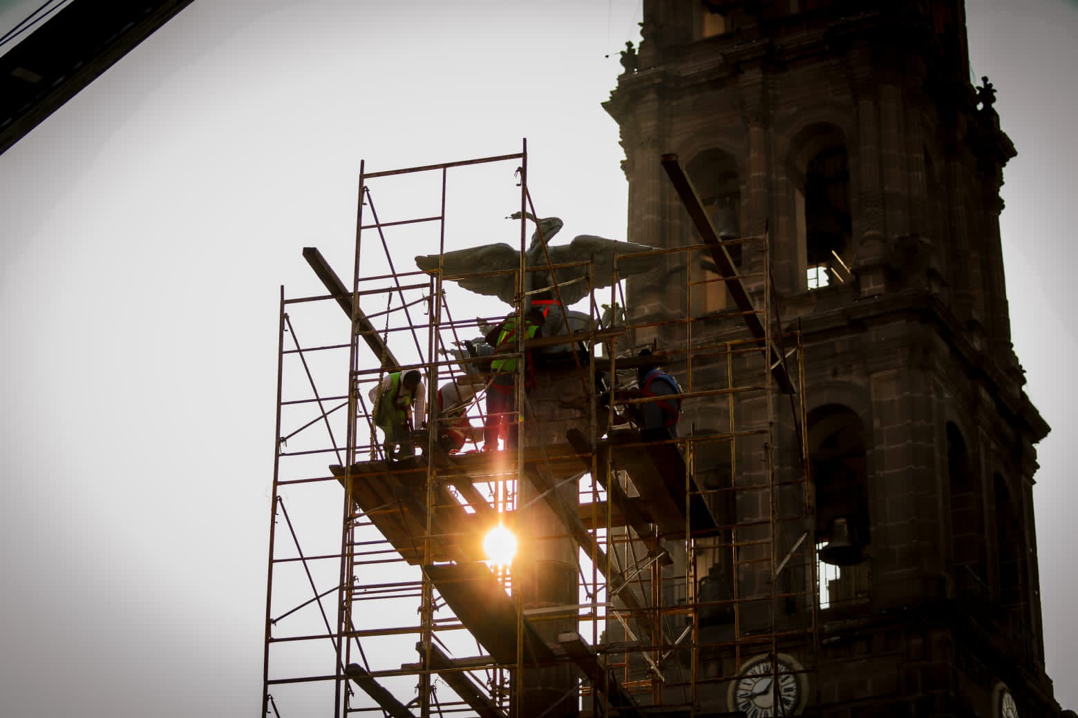 De la escultura, hecha en lámina de zinc, el metal fue tratado para limpieza química y en seco que son acciones para su restauración y conservación, mismas que se realizaron en el patio de la Casa del Diezmo.