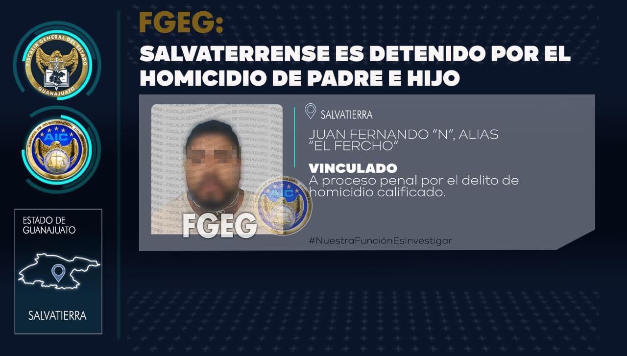 Un hombre de 28 años y su padre fueron ejecutados a balazos en su domicilio, ubicado en la colonia Álvaro Obregón en el municipio de Salvatierra; tras la investigación para ubicar al probable inculpado, la Unidad de Homicidios detuvo a un Salvaterrense identificado como JUAN FERNANDO “N” alias “El Fercho”, quien ya fue vinculado a proceso penal por el doble homicidio.