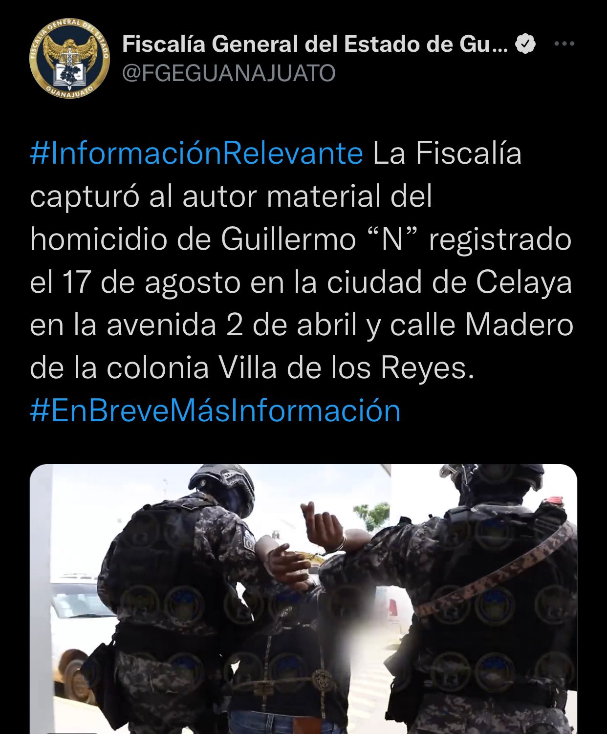 La Fiscalía capturó al autor material del homicidio de Guillermo “N” registrado el 17 de agosto en la ciudad de Celaya en la avenida 2 de abril y calle Madero de la colonia Villa de los Reyes.