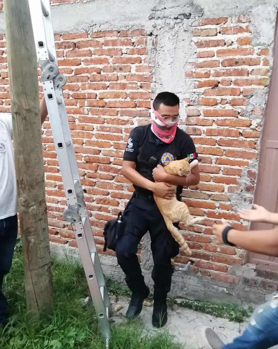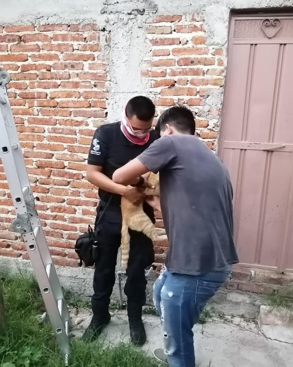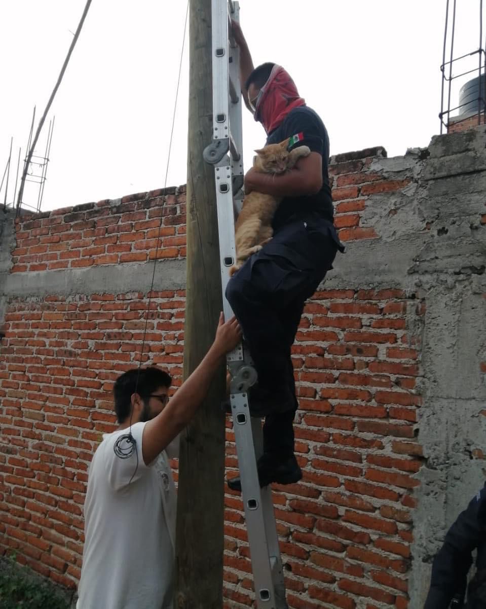 Fue el elemento Manuel García Salgado quién subió hasta donde se encontraba el gato, con apoyo de una escalera para realizar las maniobras de rescate y poder bajar el felino sano y salvo.