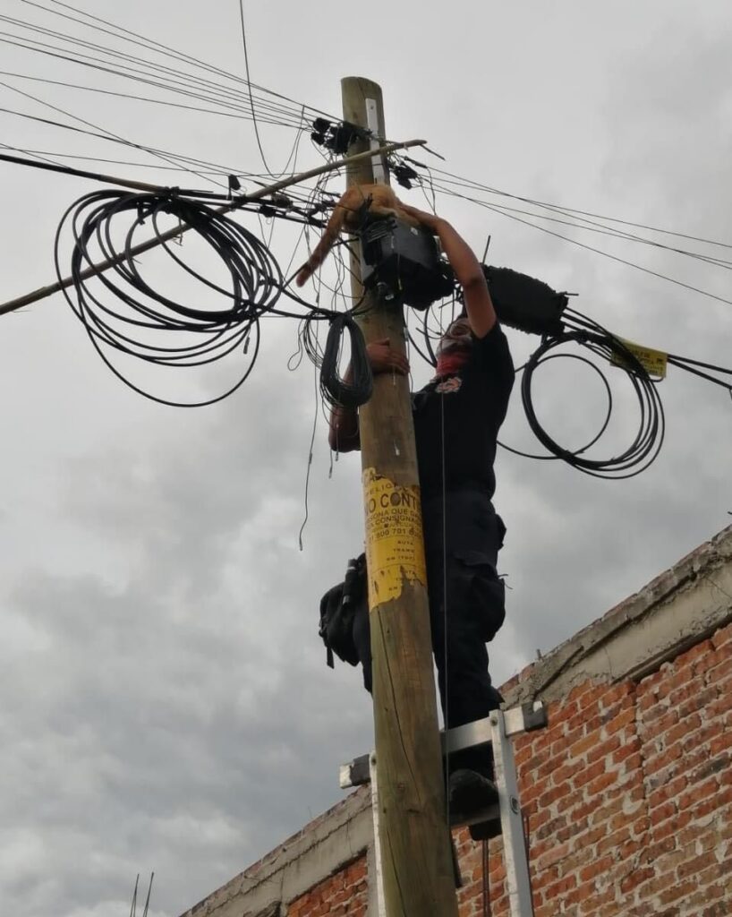 Ante la llamada de auxilio acudieron elementos de Protección Civil para rescatar al felino de color amarillo que estaba en la cima de un poste de la compañía TELMEX, hechos ocurridos alrededor de las 19:30 horas.