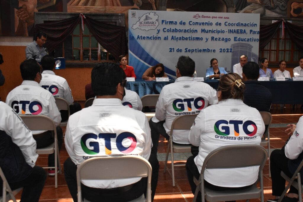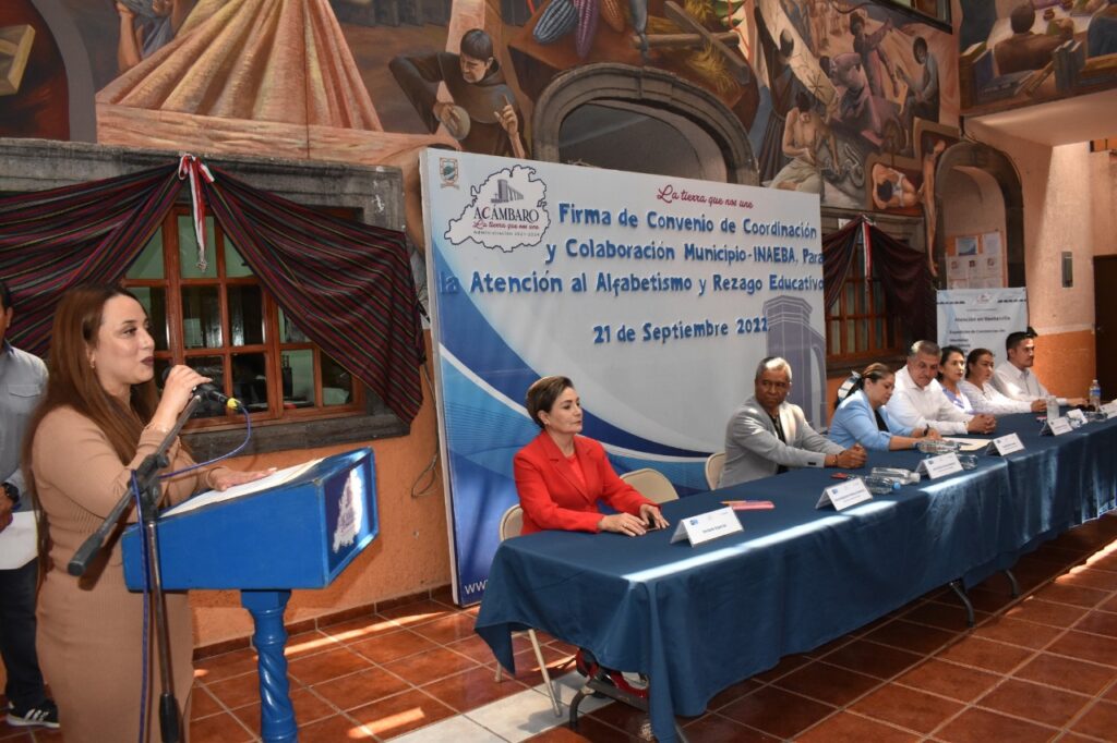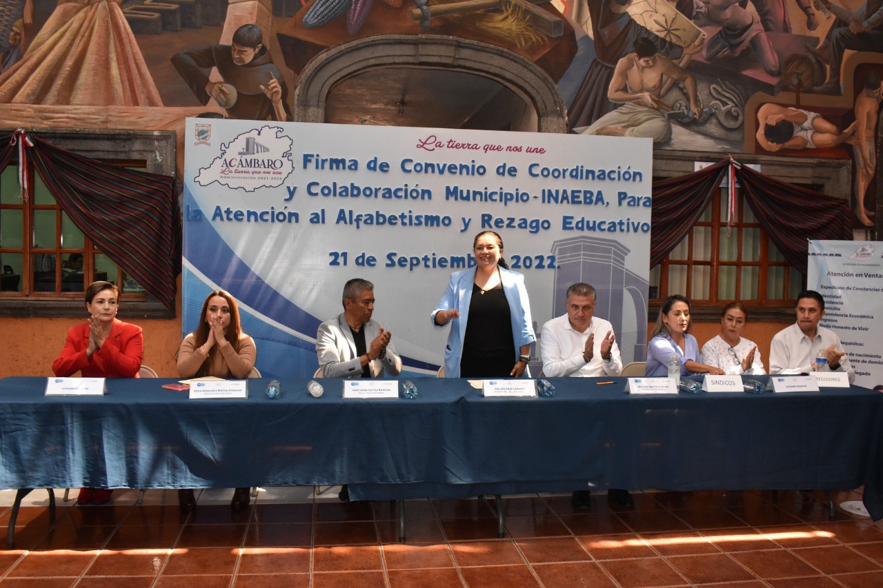 De manera protocolaria se llevó a cabo la firma del Convenio de Coordinación y Colaboración entre el Municipio de Acámbaro y el Instituto de Alfabetización y Educación Básica para los Adultos (INAEBA), con el propósito de unir esfuerzos para atender el analfabetismo y el rezago educativo del municipio.