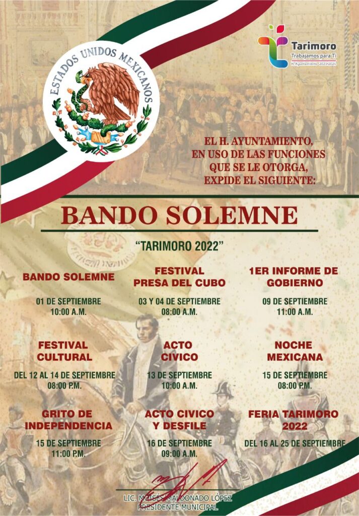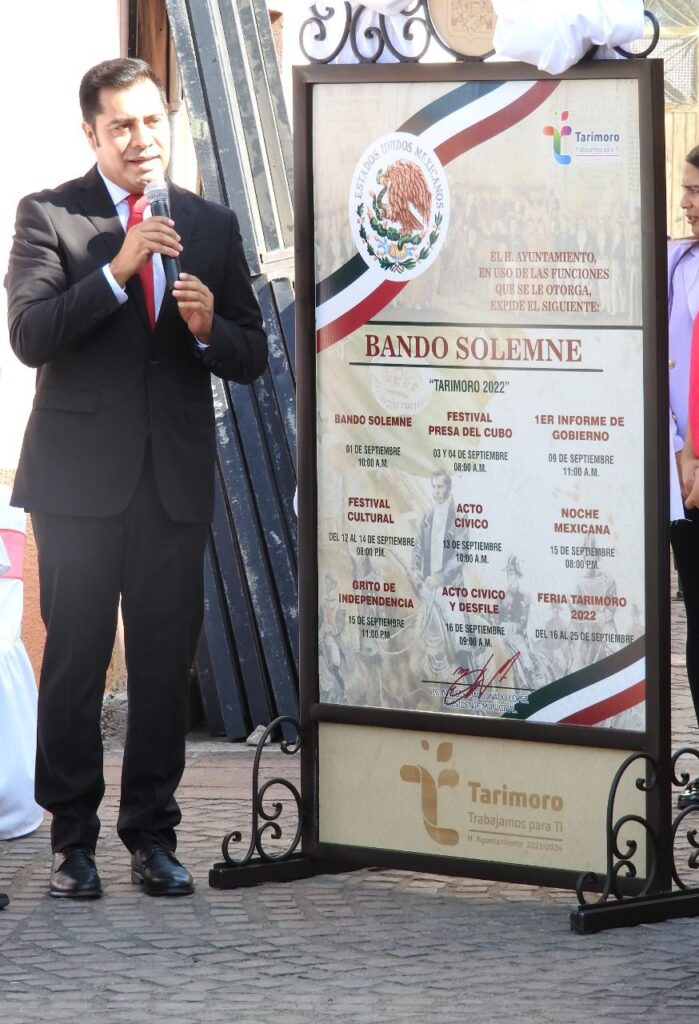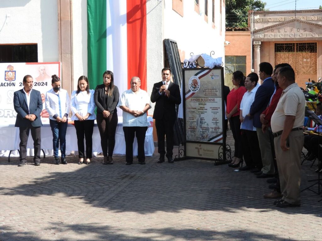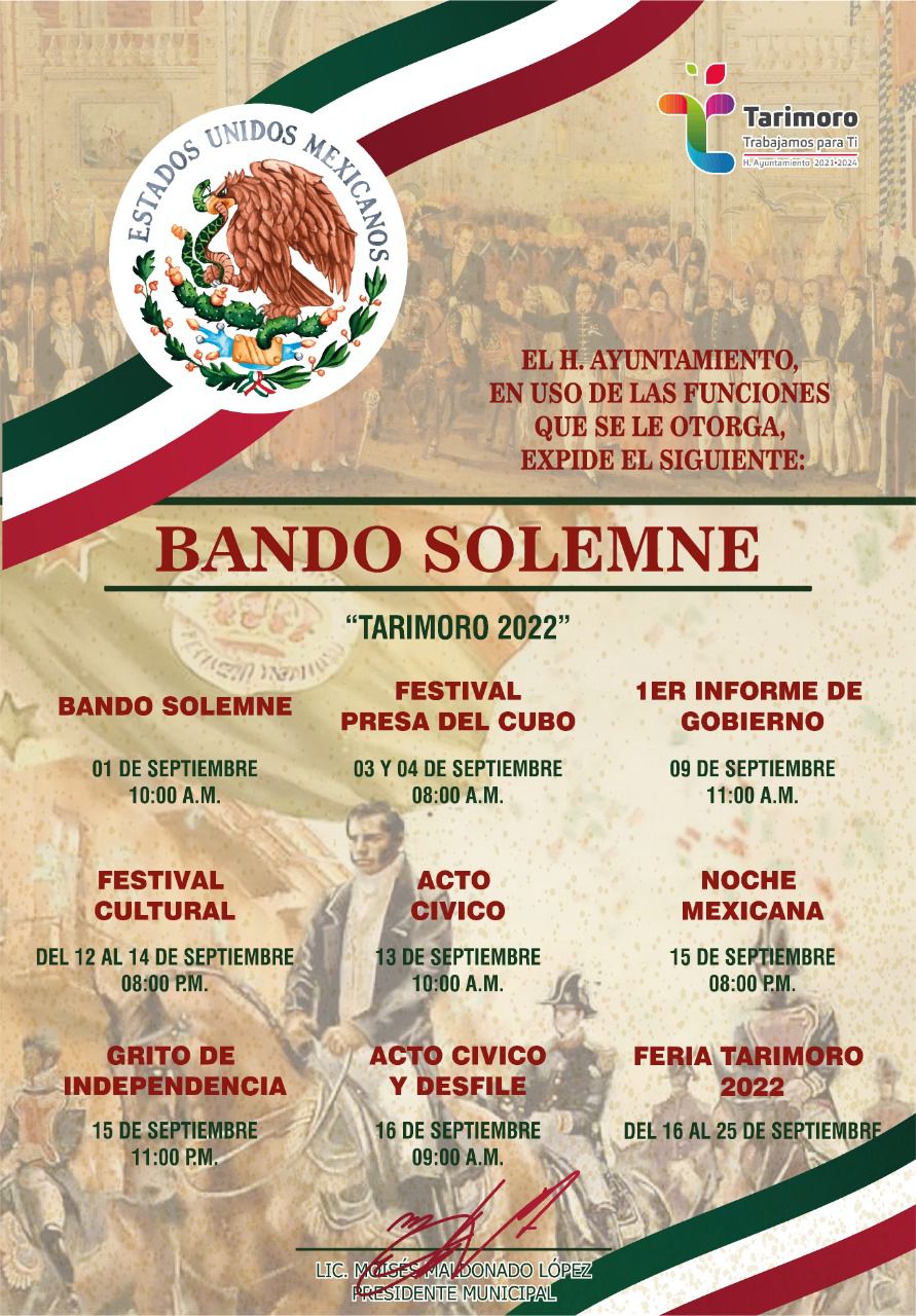 Moy Maldonado en compañía del Ayuntamiento, autoridades civiles y educativas, llevaron a cabo la develación del “Bando Solemne”, documento donde se plasman las diferentes actividades cívicas, culturales y sociales que tendrá el Municipio de Tarimoro en este mes de septiembre.