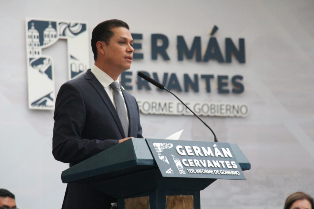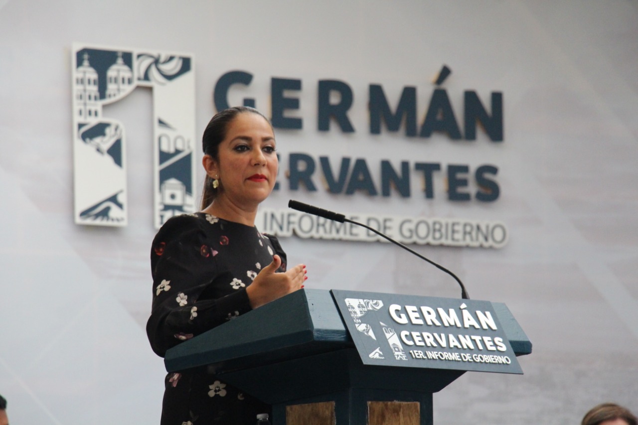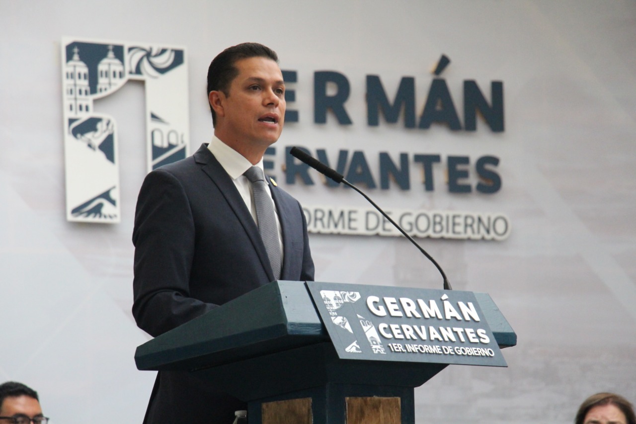 El Presidente Municipal Germán Cervantes Vega ante la presencia de la Secretaria de Gobierno del Estado de Guanajuato Libia Dennise Muñoz Ledo, Regidores y ciudadanía en general rindió su Primer Informe de Gobierno.
