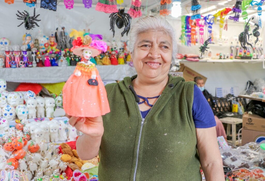 La señora Alberta cuenta que inició vendiendo 30 piezas de sus figuritas y a la fecha elabora de tres mil a cinco mil piezas, siendo la más vendida la catrina que prepara desde diciembre pues confecciona y elabora los vestidos y detalles que llevan las piezas.